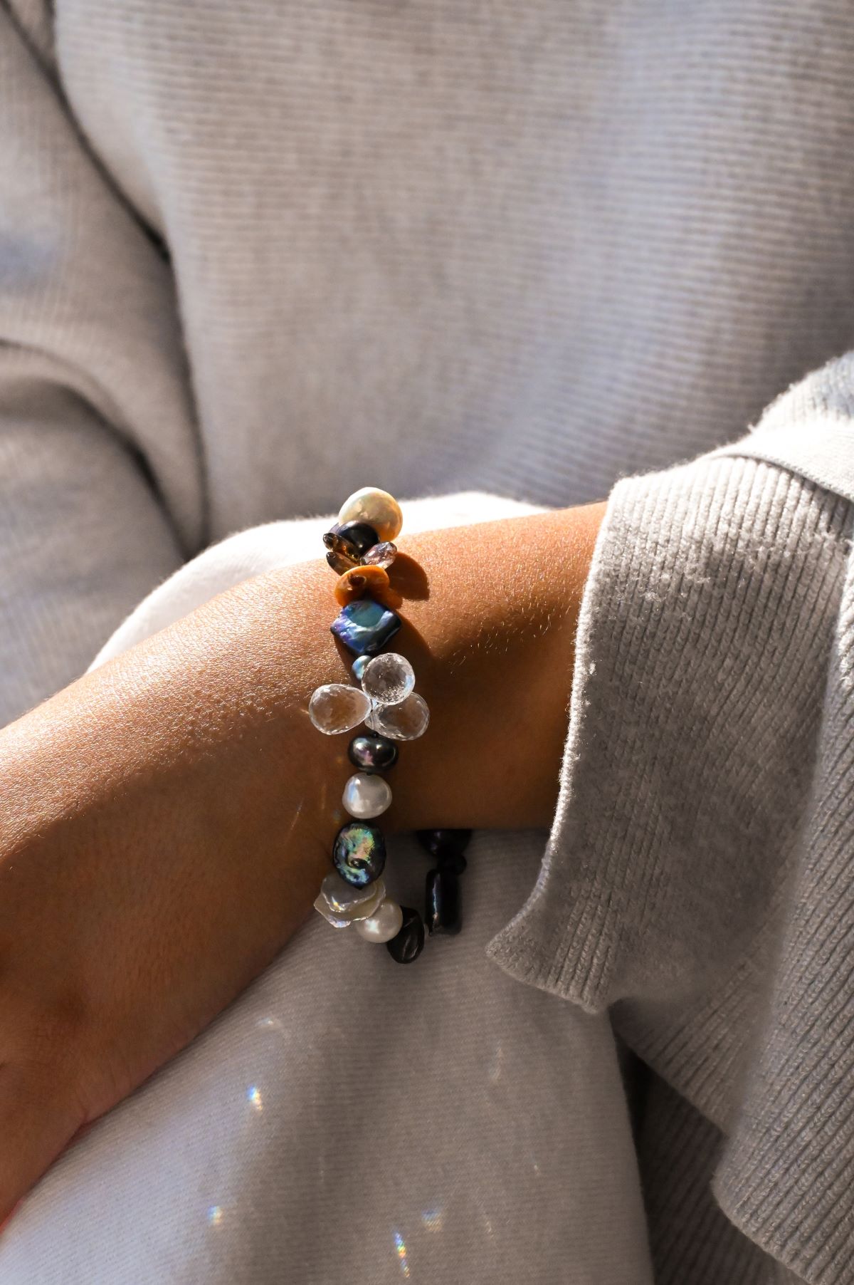 A vibrant blend of texture, shape, and color, this one-of-a-kind bracelet features a rich combination of freshwater pearls and natural gemstones. Composed of grey-blue flat and oval square pearls, white round and keshi pearls, and gold-tone coin-shaped pearls, it’s accented with briolette Andalusite, crystal quartz, and faceted iolite for added sparkle and dimension. Finished with a sterling silver lobster clasp and end, this piece brings an artful, organic elegance to any jewelry collection.