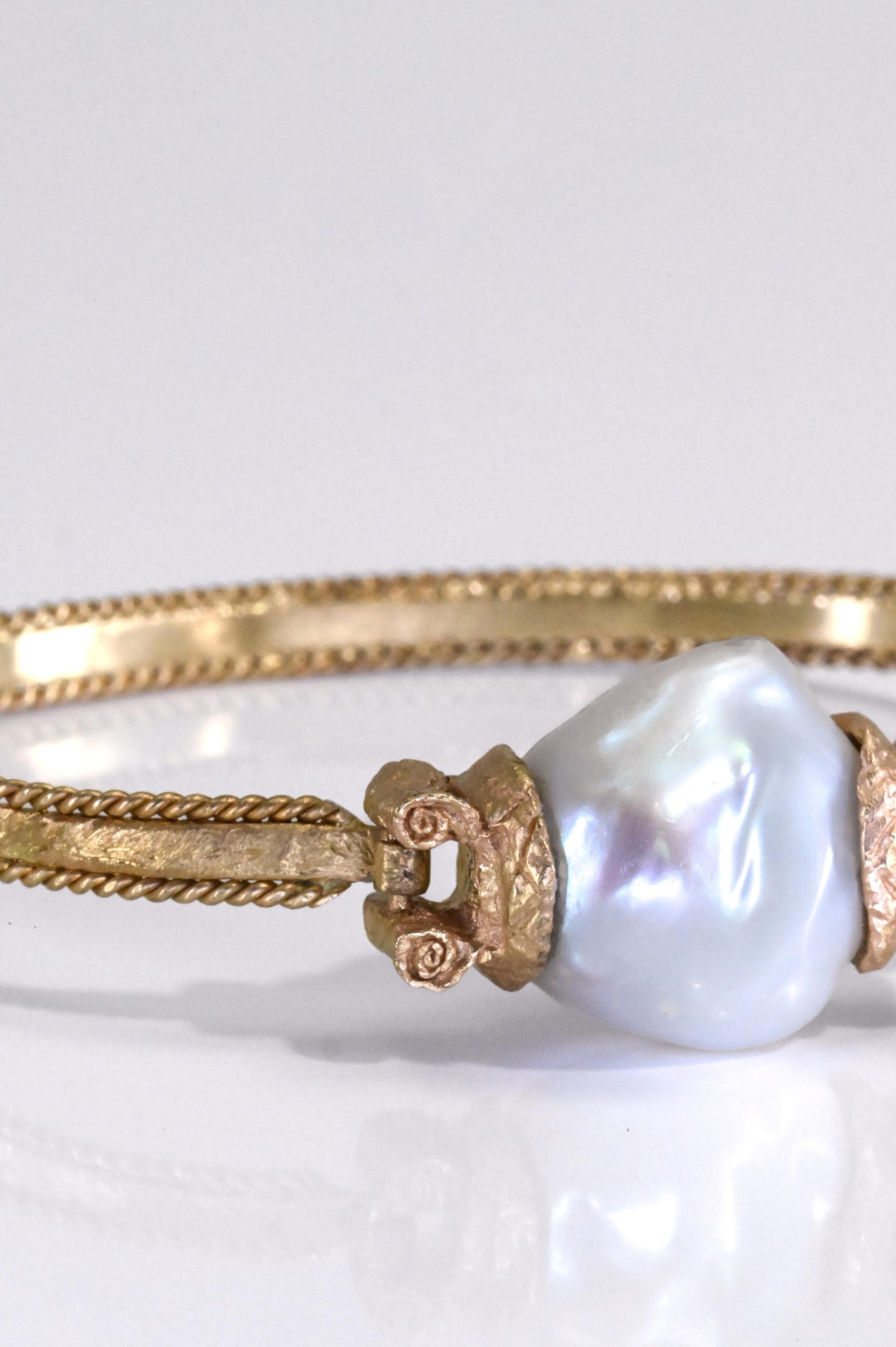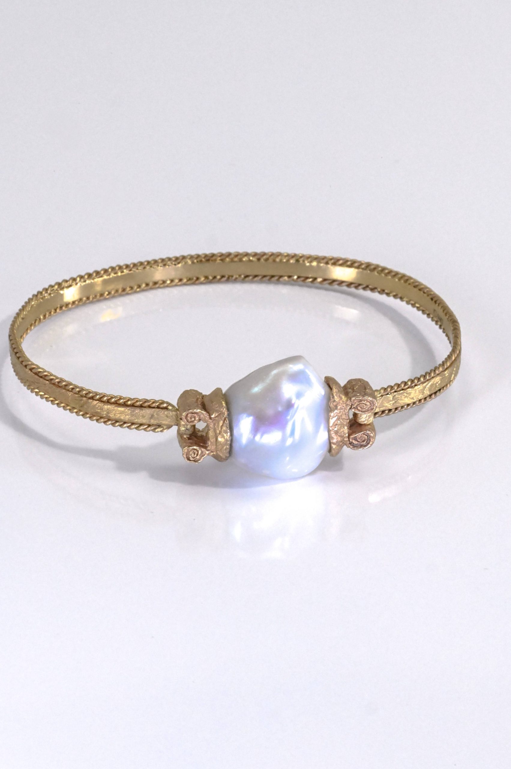 Crafted in a sculptural clip-bangle design, this bracelet features a luminous large freshwater pearl elegantly suspended between two architectural column-style finials, evoking the grandeur of Romanesque artistry. A refined plate-and-wire bracelet construction enhances its classical silhouette, while the rich warmth of 14-karat yellow gold adds timeless sophistication.