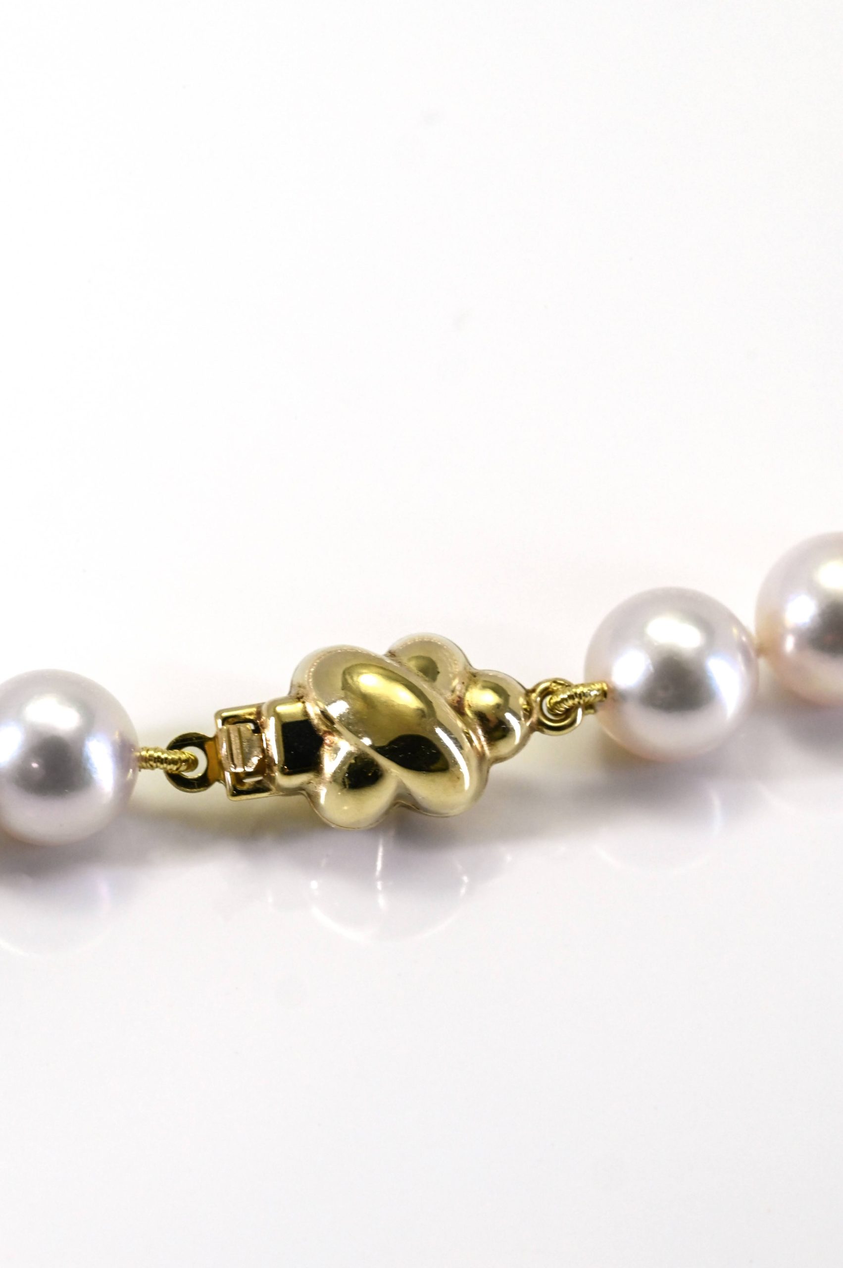 A classic necklace of Akoya cultured pearls measuring 7.5 to 8 millimetres, composed of fifty three pearls individually knotted on silk for elegance and durability. The strand measures 18 inches in length and is finished with a 14 karat yellow gold clasp featuring a refined knot motif. Timeless and graceful, this necklace embodies traditional pearl craftsmanship with understated sophistication.