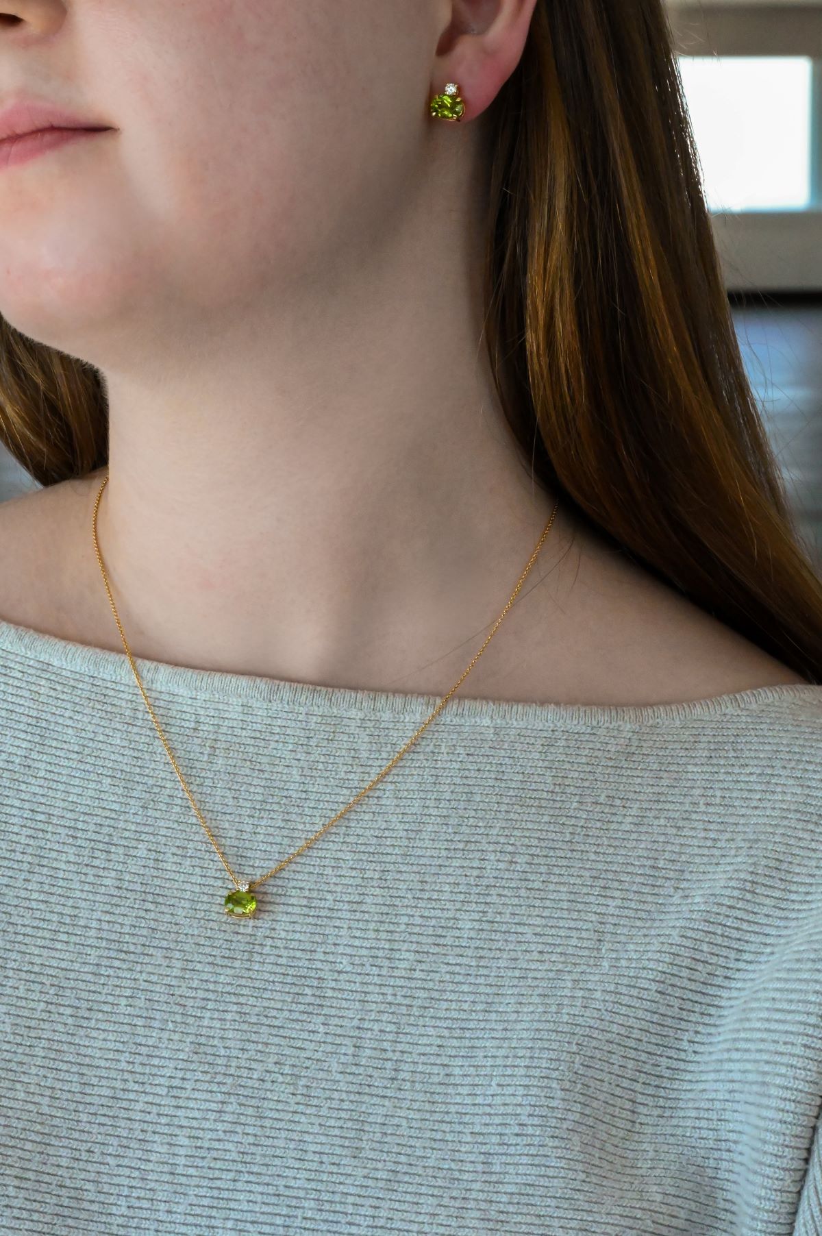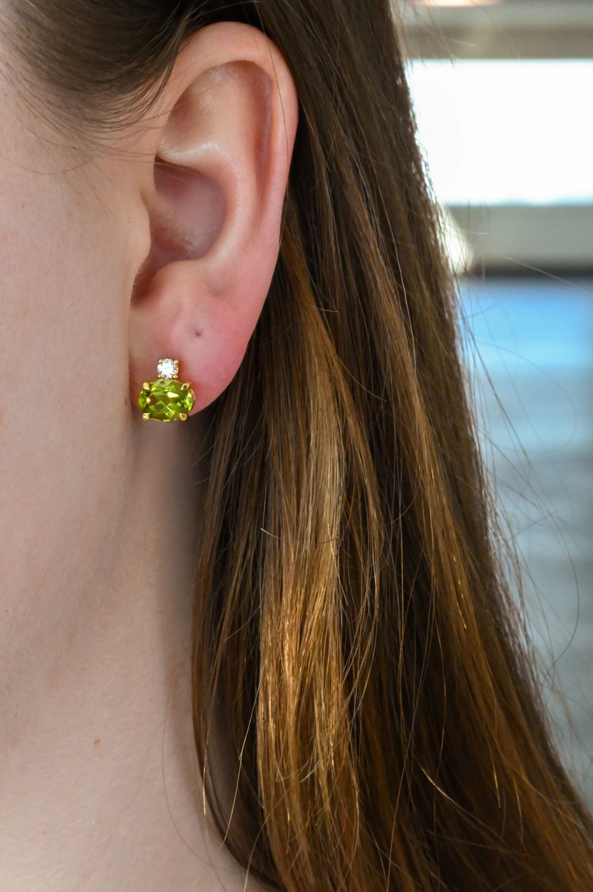 Crafted in rich 18 karat yellow gold, this elegant pair of pierced earrings features traverse-set natural Peridots with a vibrant green hue, totaling 2.81 carats. Accentuating the design are sparkling round brilliant cut Diamonds, with a total weight of 0.18 carats, graded VS2 clarity and F-G colour. A refined and colourful accessory perfect for both everyday elegance and special occasions.