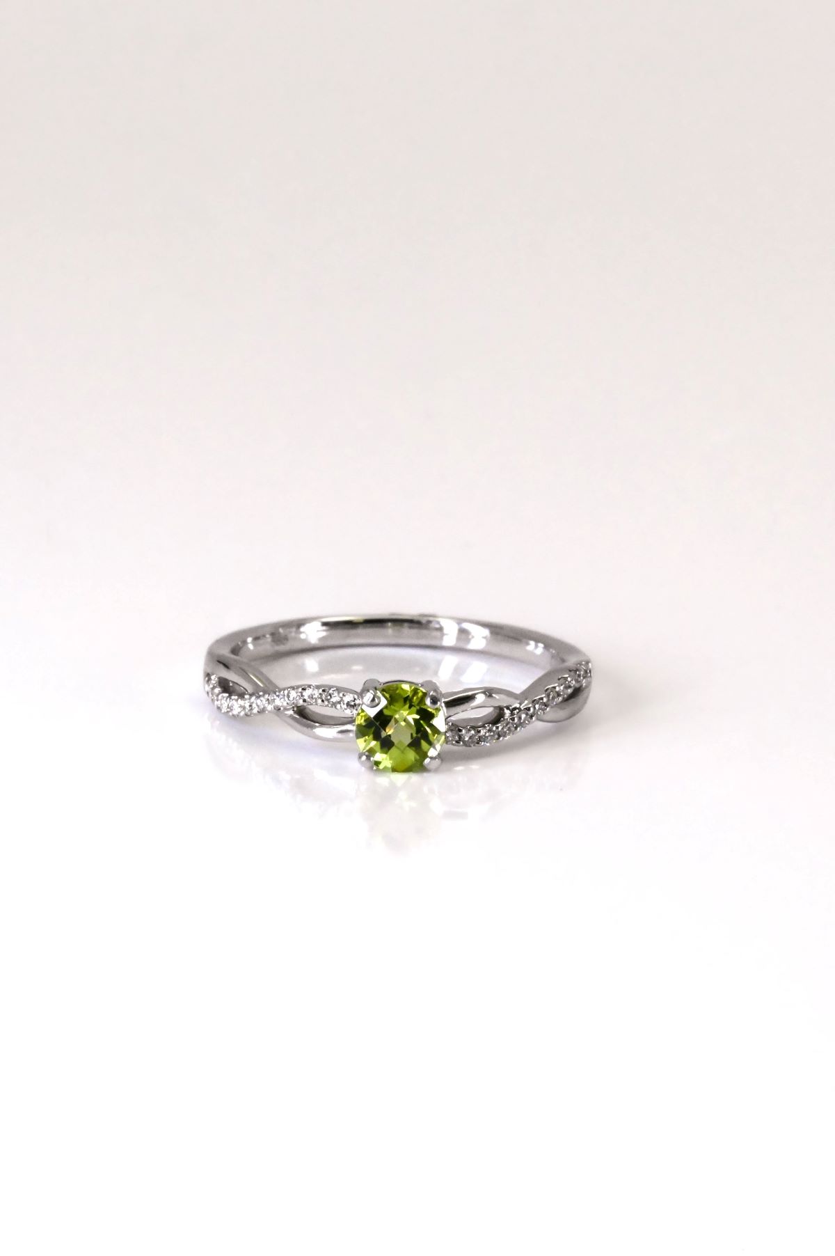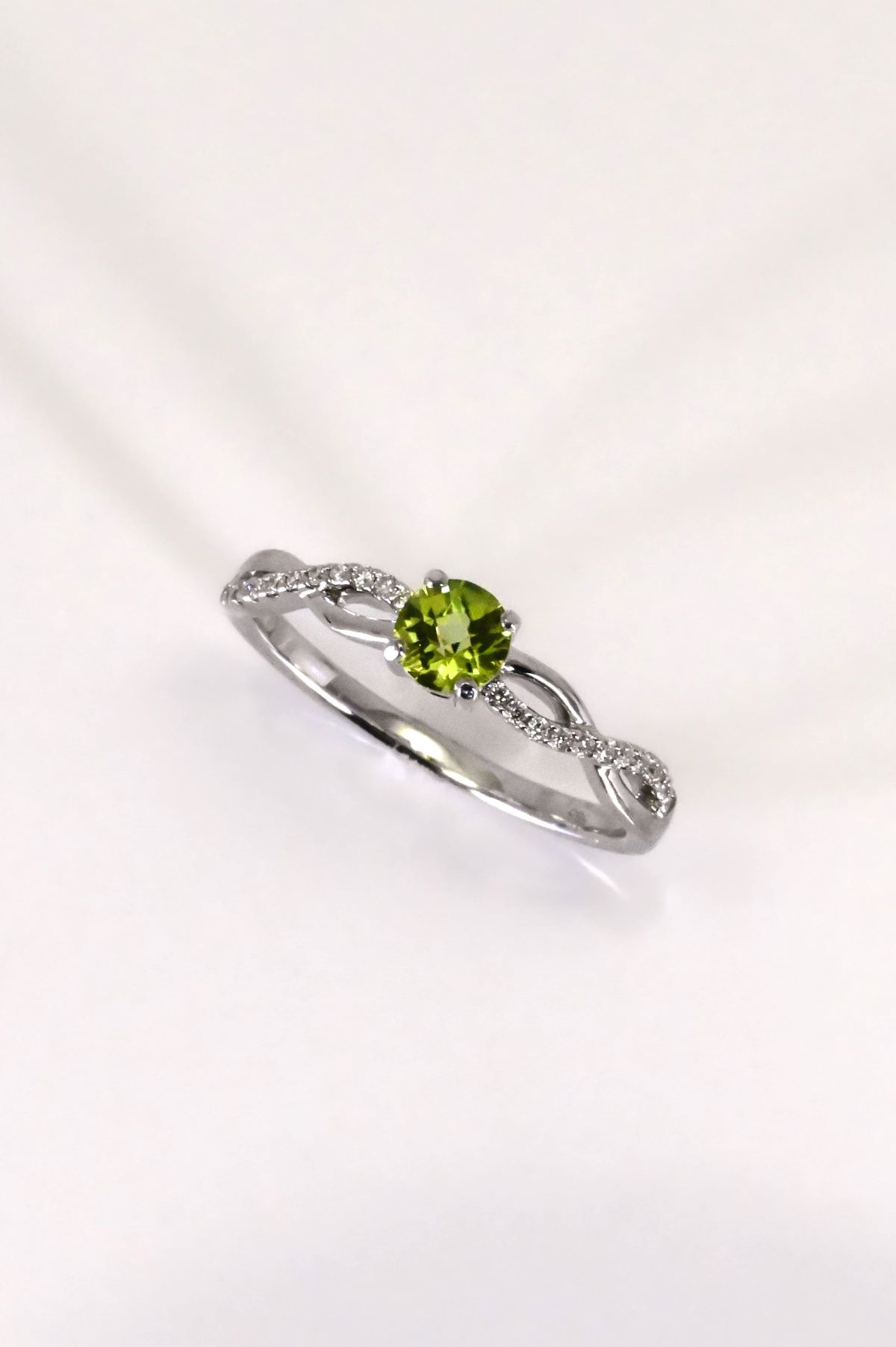 This elegant 14 karat white gold ring features a vibrant 4mm round peridot at its center, flanked by round brilliant cut diamonds totaling 0.10cts. Set with micro claw settings along graceful crossover shoulders and finished in a polished high-shine, this ring combines contemporary design with classic sparkle.
