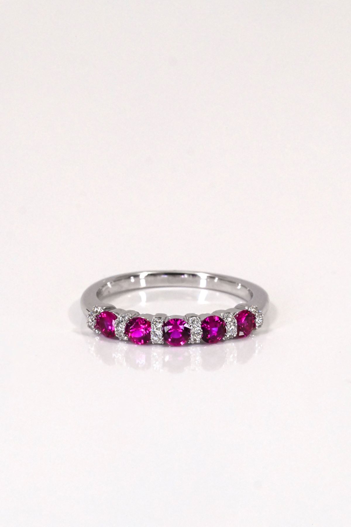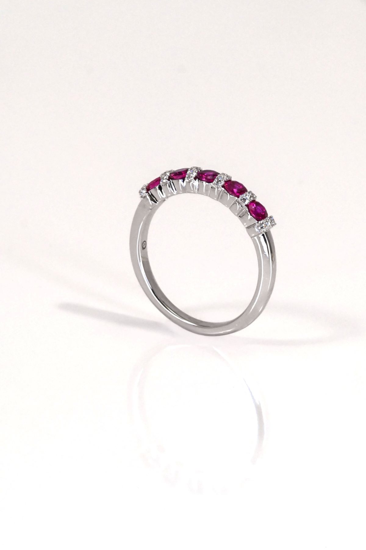 A timeless anniversary band style ring crafted in luminous 18 karat white gold. The design features a graceful line of alternating gemstones, set with five natural rubies totaling 0.63 carats and eighteen round brilliant cut diamonds totaling 0.15 carats. Elegant and balanced, this ring offers rich colour contrast and refined sparkle, making it a meaningful and sophisticated statement piece.