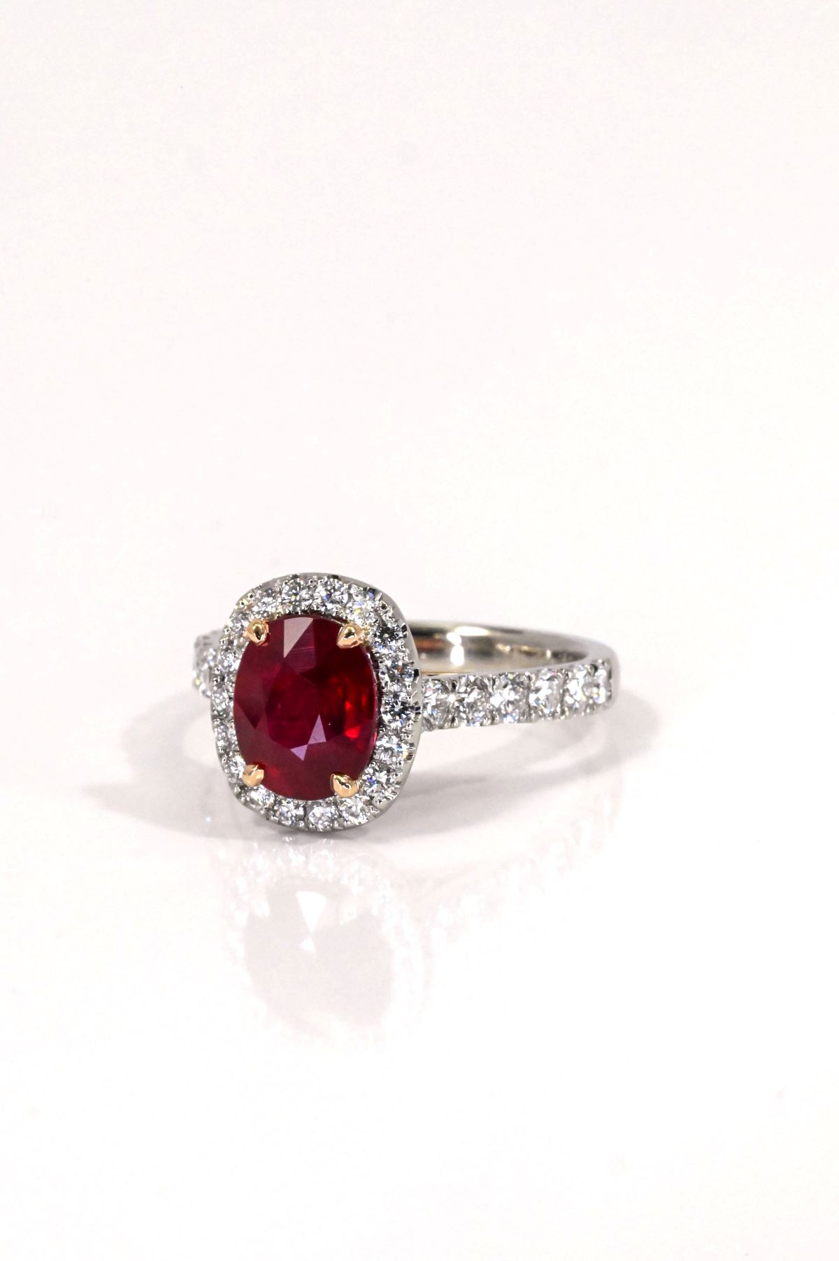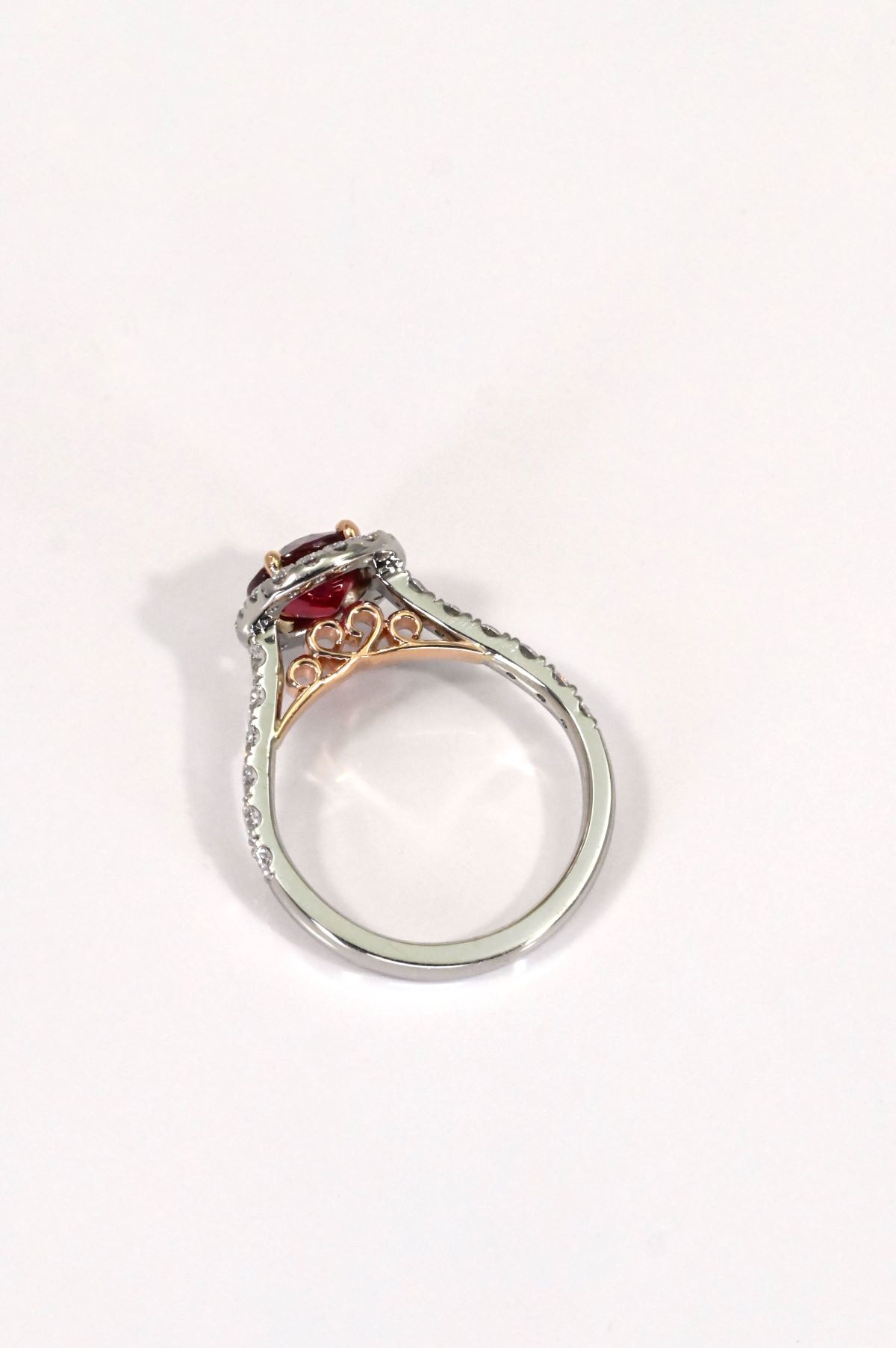 A stunning blend of craftsmanship and elegance, this hand-fabricated ring features a 2.07 carat oval faceted natural ruby, displaying a deep, rich red hue. GIA certified, the ruby is beautifully framed by a halo of round brilliant cut diamonds, totaling 0.87 carats, all graded VS clarity and F color. Crafted in 19Kt white gold with 18Kt rose gold accents, this exceptional piece offers timeless beauty with a touch of warmth and contrast.