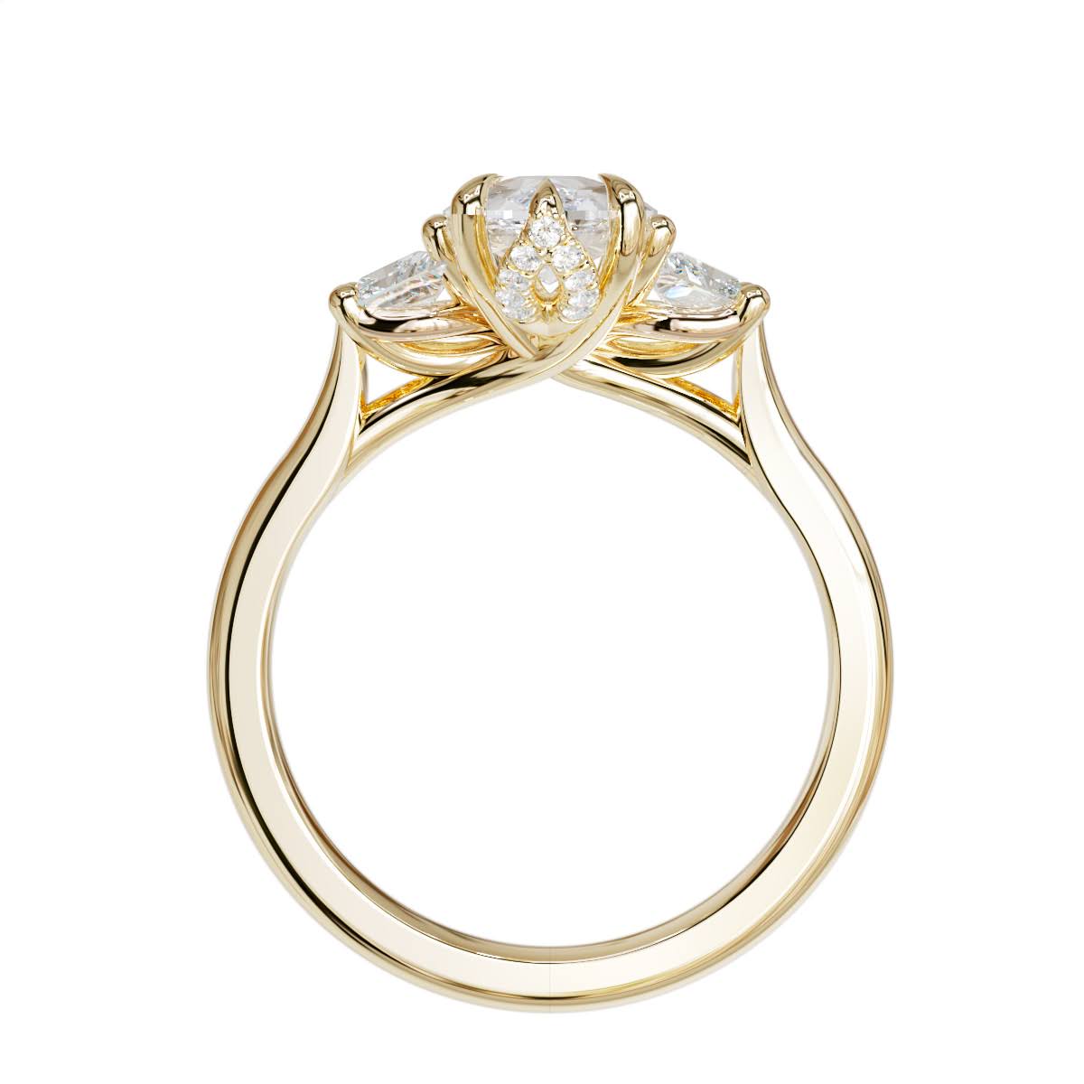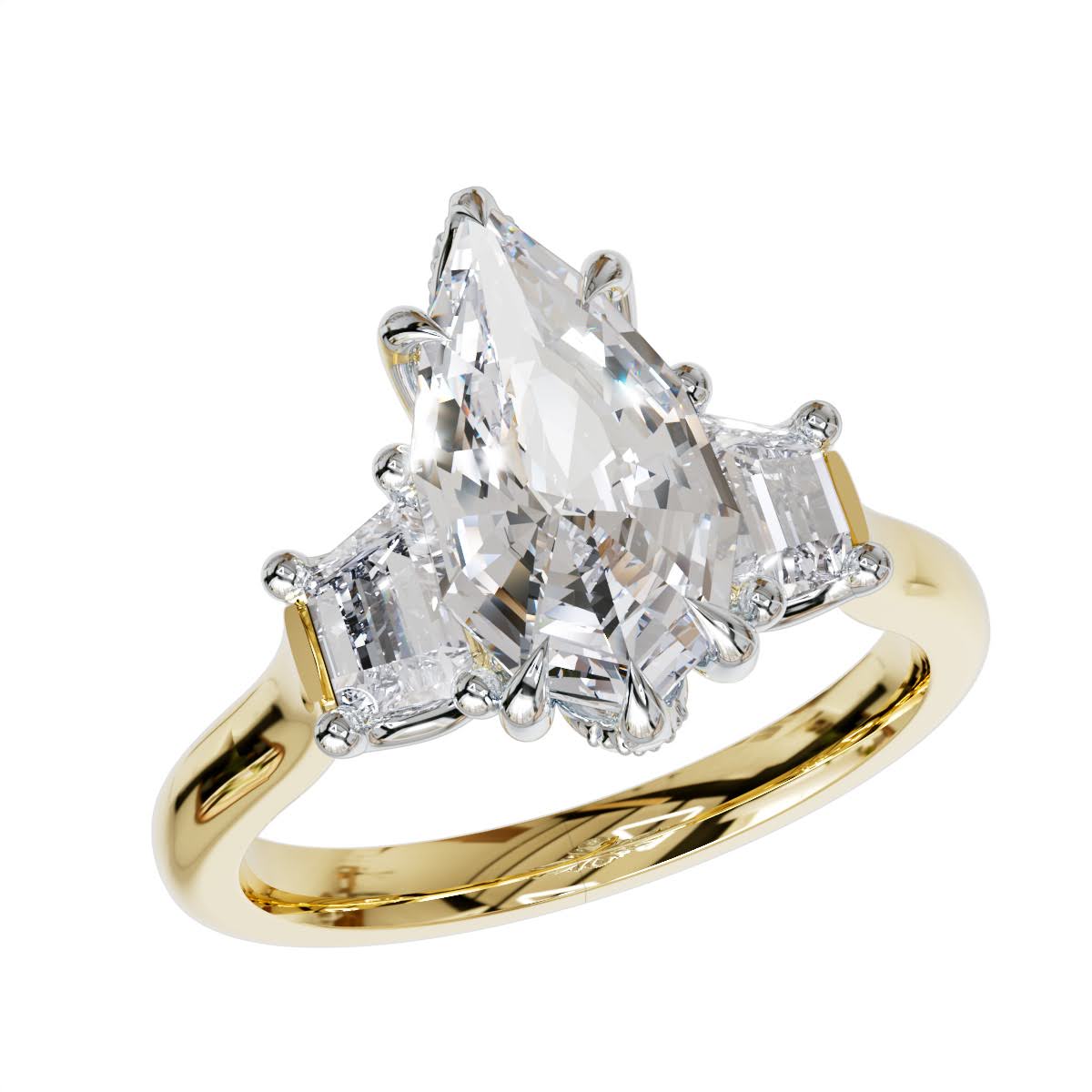 This graceful ring captures the brilliance of spring’s first light, with a diA refined take on a nature-inspired classic. This three-stone ring features a sleek step-cut pear diamond at its center, flanked by crisp trapezoid shoulder stones. The clean lines and symmetry offer a modern balance to its organic inspiration—like sunlight filtering through fresh leaves, with each facet echoing quiet elegance and sculptural grace.