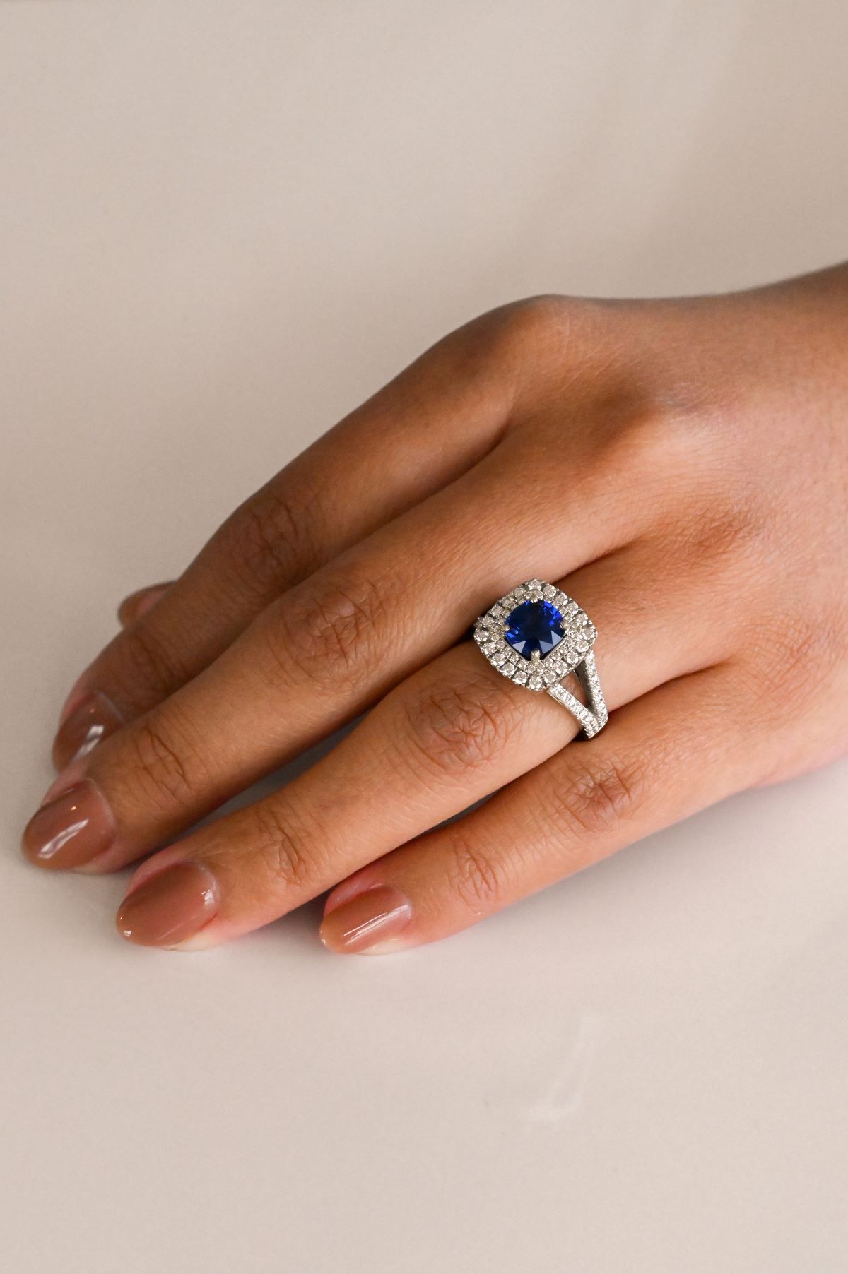 This dazzling 19Kt white gold dinner ring features a 1.91ct square cushion-cut natural Ceylon blue sapphire of exceptional quality. Framed by a striking double halo and diamond-set shoulders, the design is accented with 76 round brilliant cut diamonds (0.96cts total, SI/F), creating a luxurious and eye-catching statement piece.