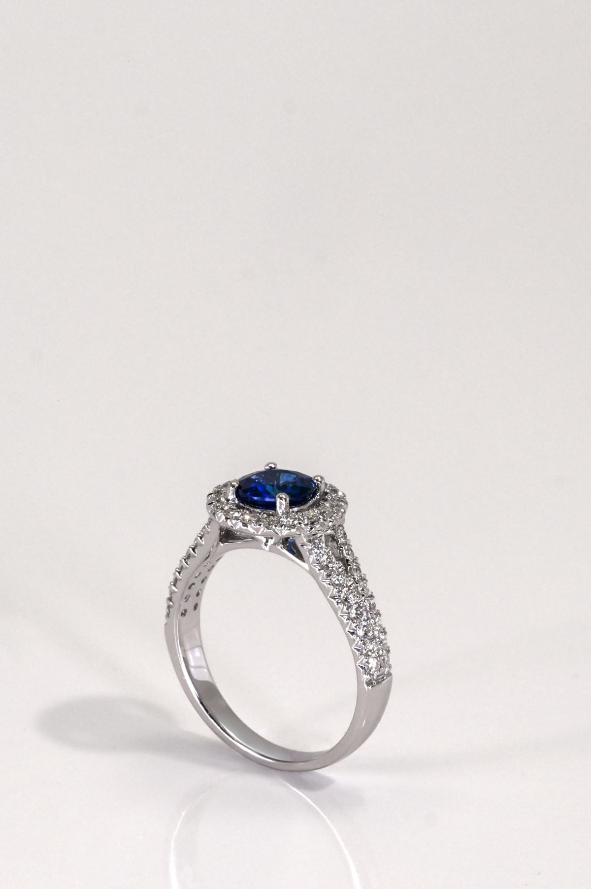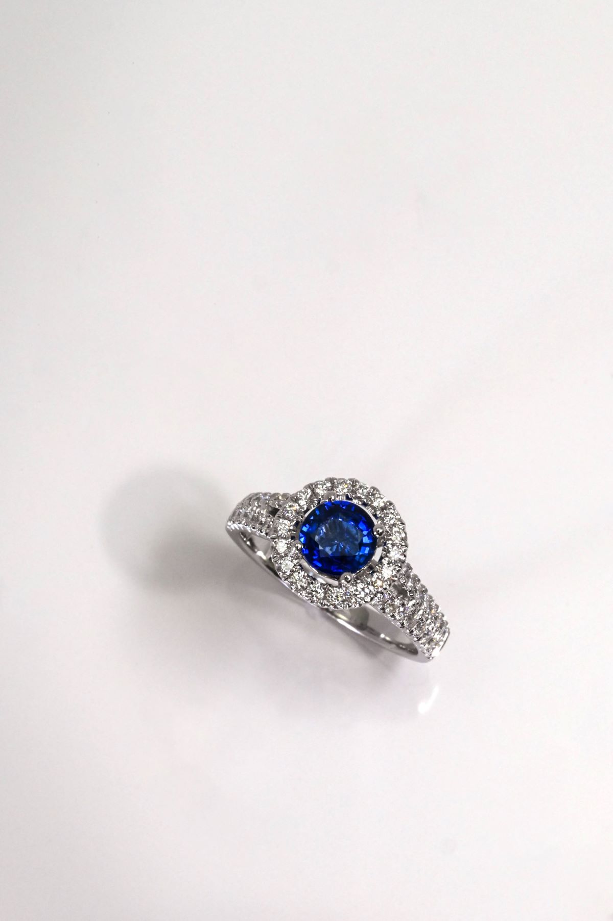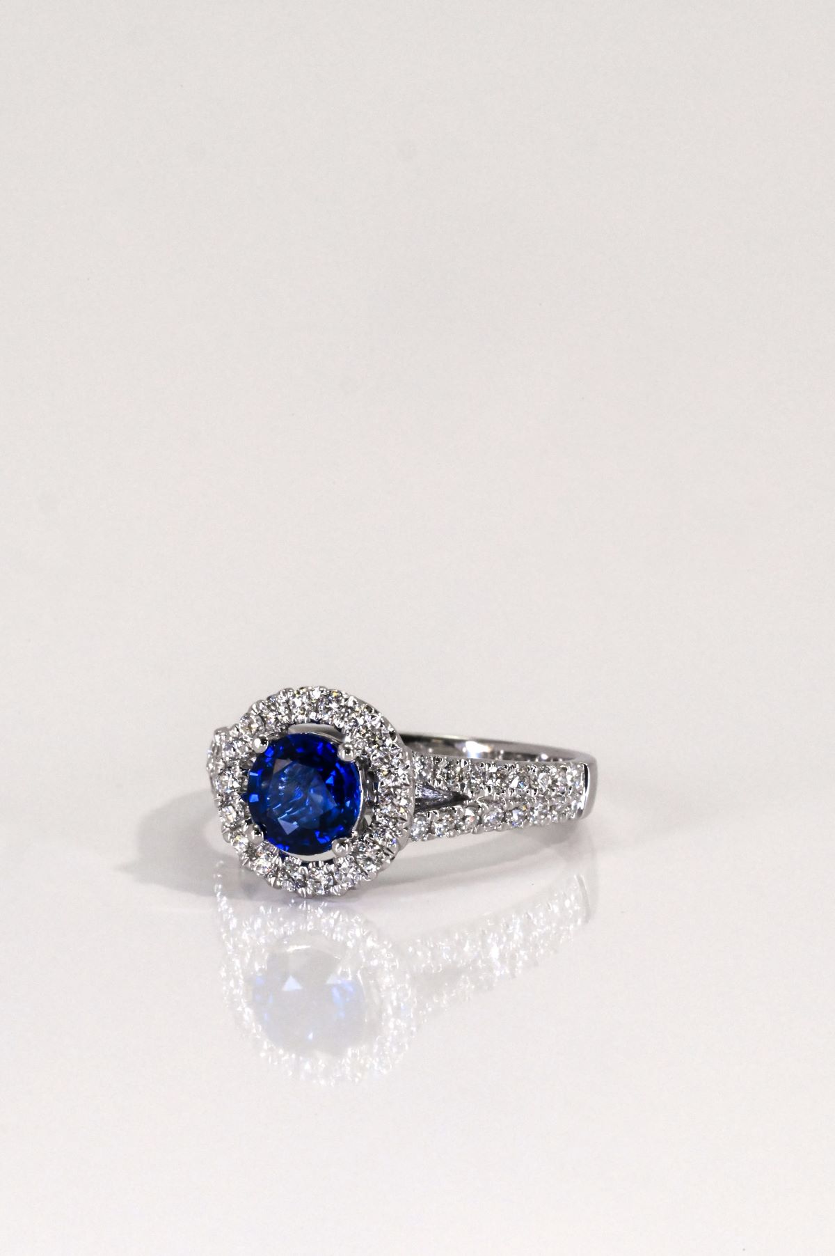 Timeless and refined, this 18Kt white gold dinner ring showcases a vibrant 0.91 carat round faceted natural Ceylon blue sapphire, prized for its rich and captivating color. The sapphire is surrounded by a sparkling diamond halo and complemented by a split shoulder band adorned with round brilliant cut diamonds. The diamonds total 0.54 carats, graded VS2 clarity and F/G color, adding brilliance and elegance to the design. Cast and hand-finished for exceptional craftsmanship, this ring is a stunning statement of classic beauty.