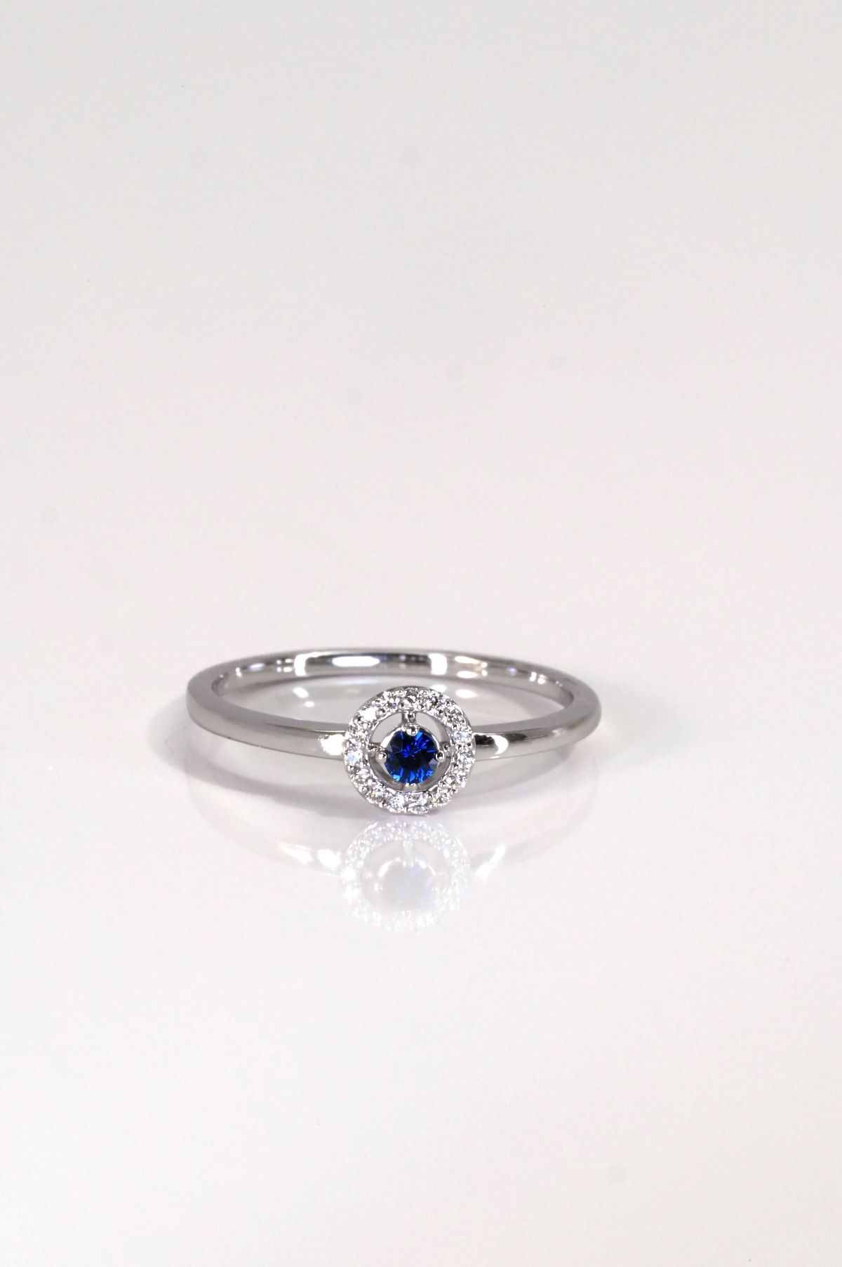 Delicate and timeless, this 14Kt white gold ring features a 0.07ct round blue sapphire at its center, surrounded by a sparkling halo of natural diamonds totaling 0.06ct. A refined piece perfect for everyday elegance or meaningful gifting.