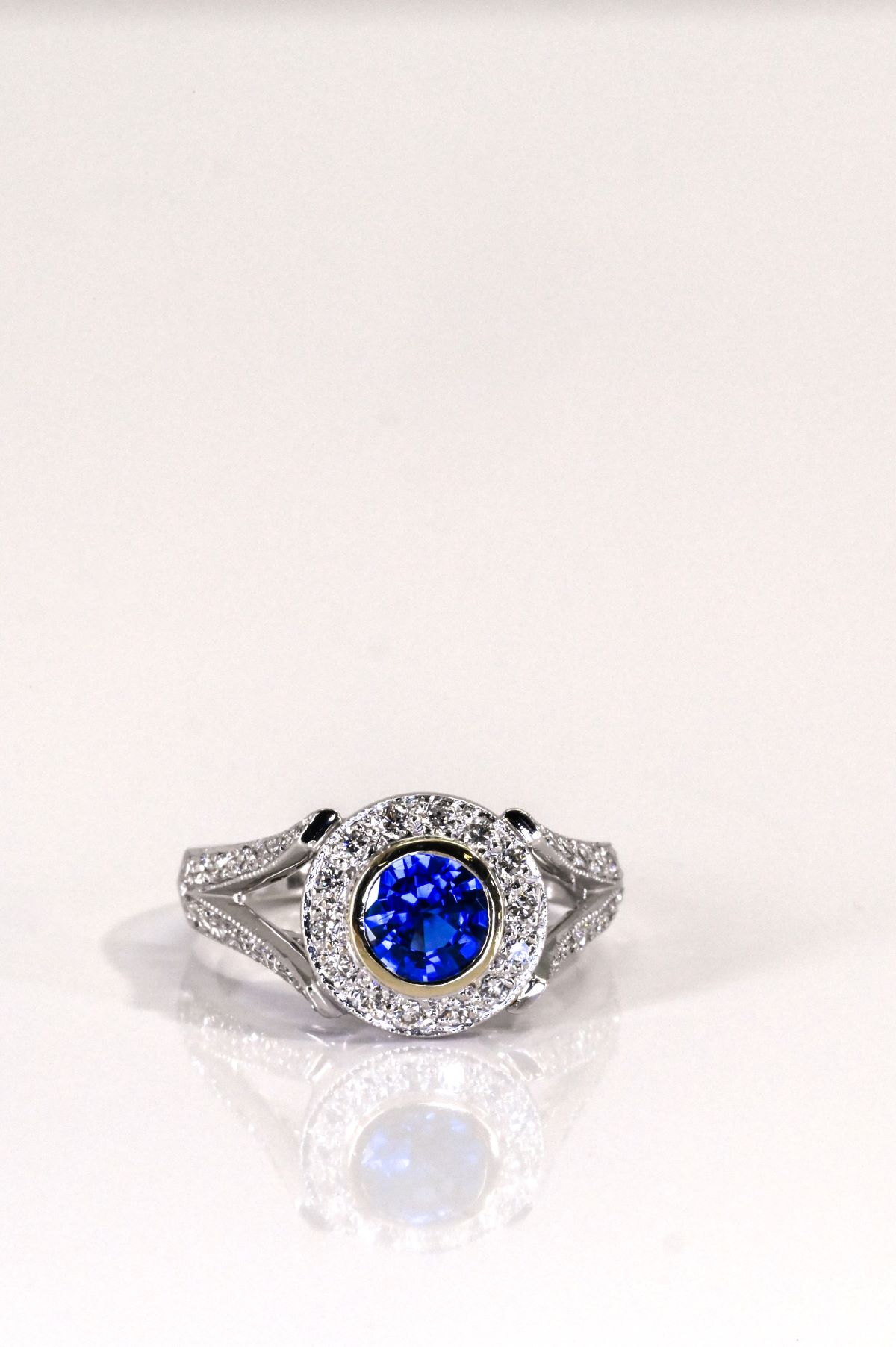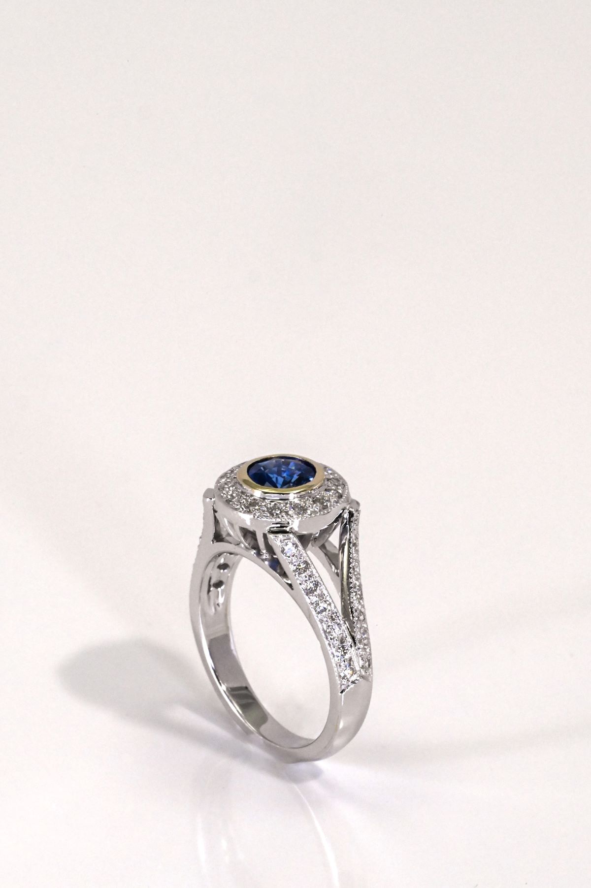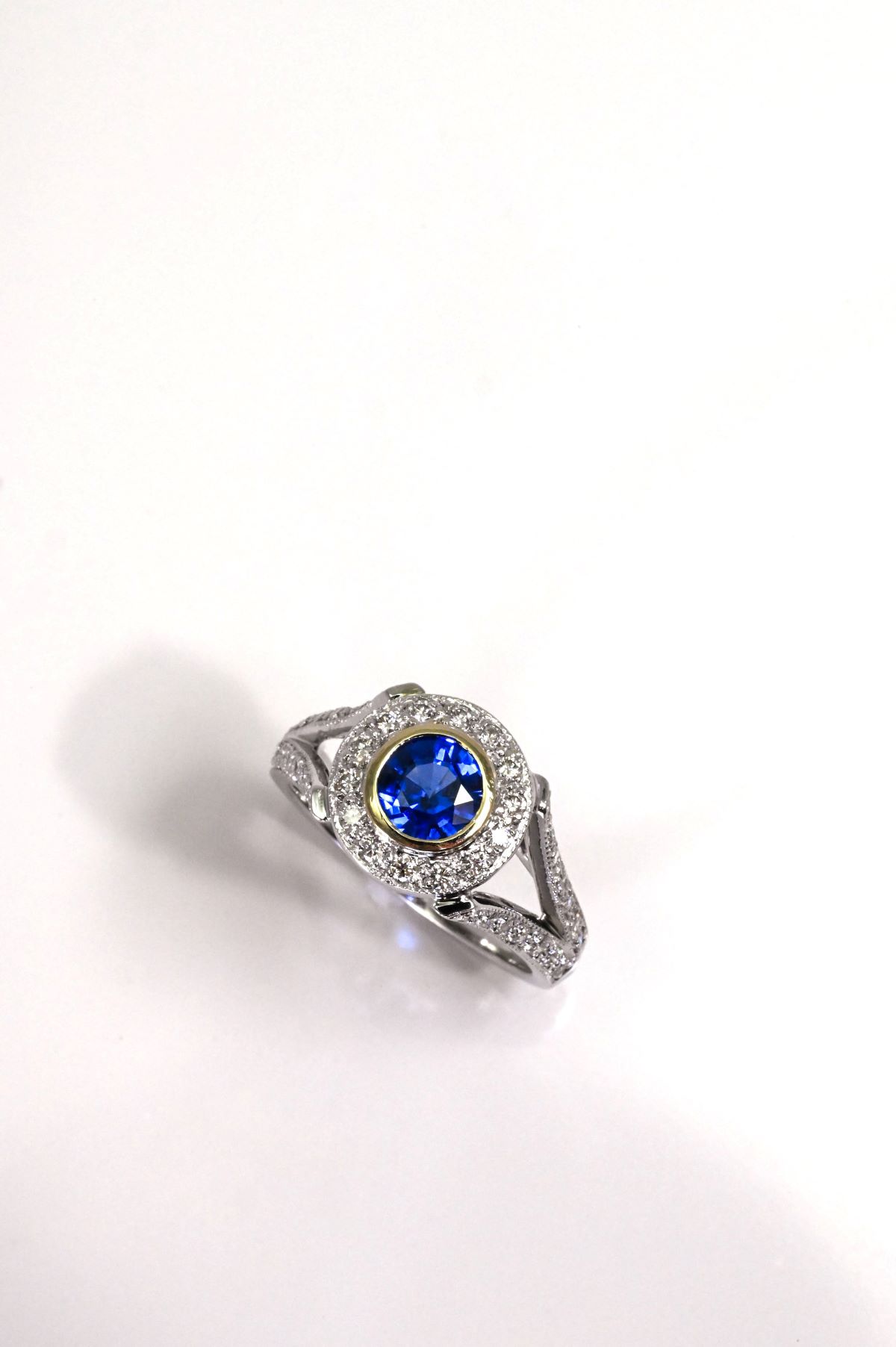 Crafted in 18Kt white gold, this elegant ladies’ dinner ring features a bezel-set 0.94ct round Ceylon sapphire, accented by small round brilliant cut diamonds totaling 0.52cts. The split shank design adds a modern touch to this timeless, sophisticated piece.