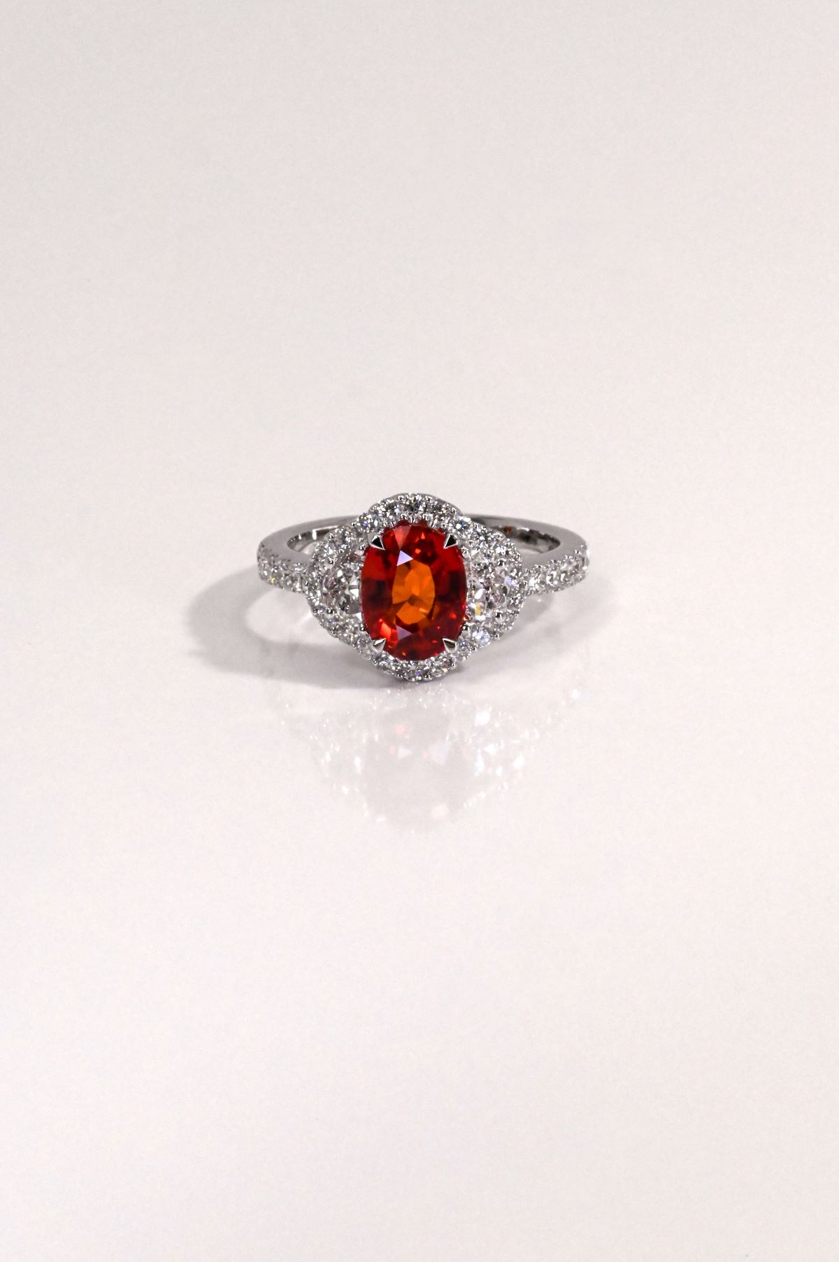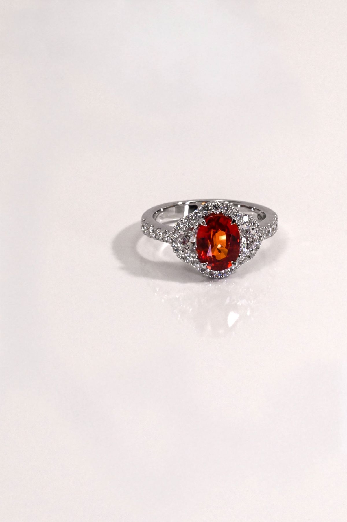 This elegant dinner ring, crafted in 18K white gold, features a modified halo design with a three-stone center and a diamond-set band for added brilliance. At its heart sits a 2.24ct oval faceted natural sapphire, displaying an intense medium reddish-orange hue, complemented by two half-moon brilliant-cut natural diamonds totaling 0.39cts, graded VS/F–G. Surrounding the center are 32 round brilliant-cut diamonds totaling 0.58cts, VS/F–G, which enhance the vibrancy of the sapphire and add luxurious sparkle. A sophisticated and striking piece, perfect for special occasions or as a statement of refined taste.