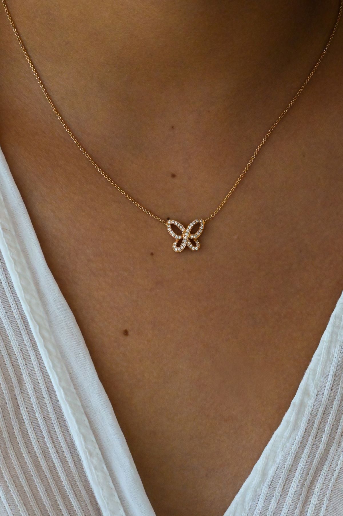 A graceful butterfly pendant in 14Kt. rose gold, symbolizing beauty and transformation. The design is bead set with 0.17cts. of sparkling round brilliant cut Diamonds in fine SI clarity and G–H colour, suspended elegantly from a matching chain.
