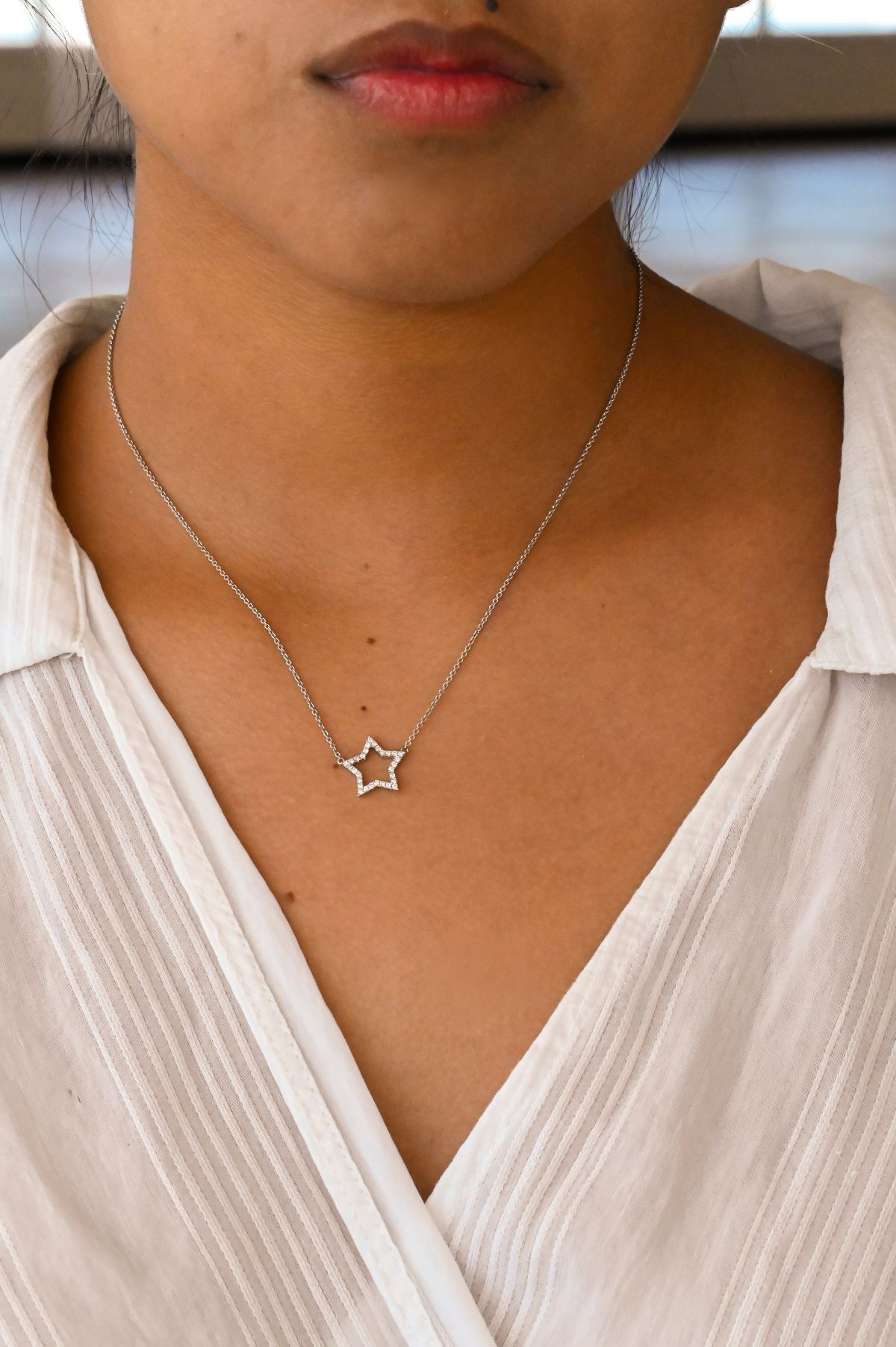A luminous 14Kt. white gold star-shaped pendant, delicately in-line and adorned with 30 sparkling round brilliant cut Diamonds totaling 0.21cts. (SI clarity, G colour). Suspended from a refined white gold rolo chain with a secure lobster claw clasp, this celestial-inspired piece brings a touch of elegance and radiance to every occasion.