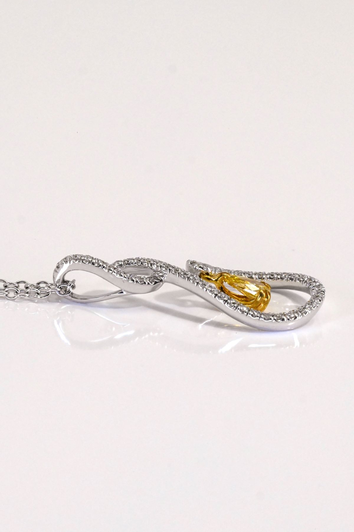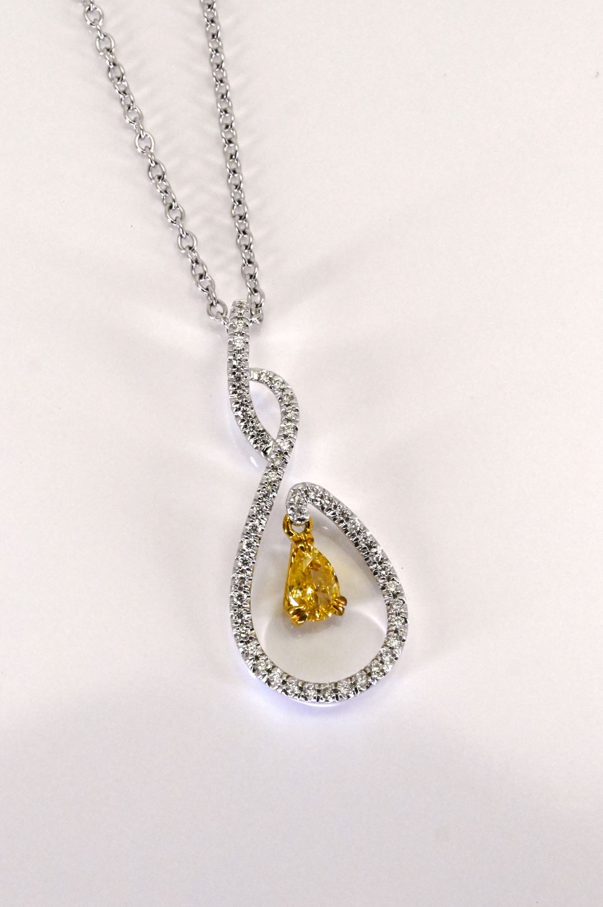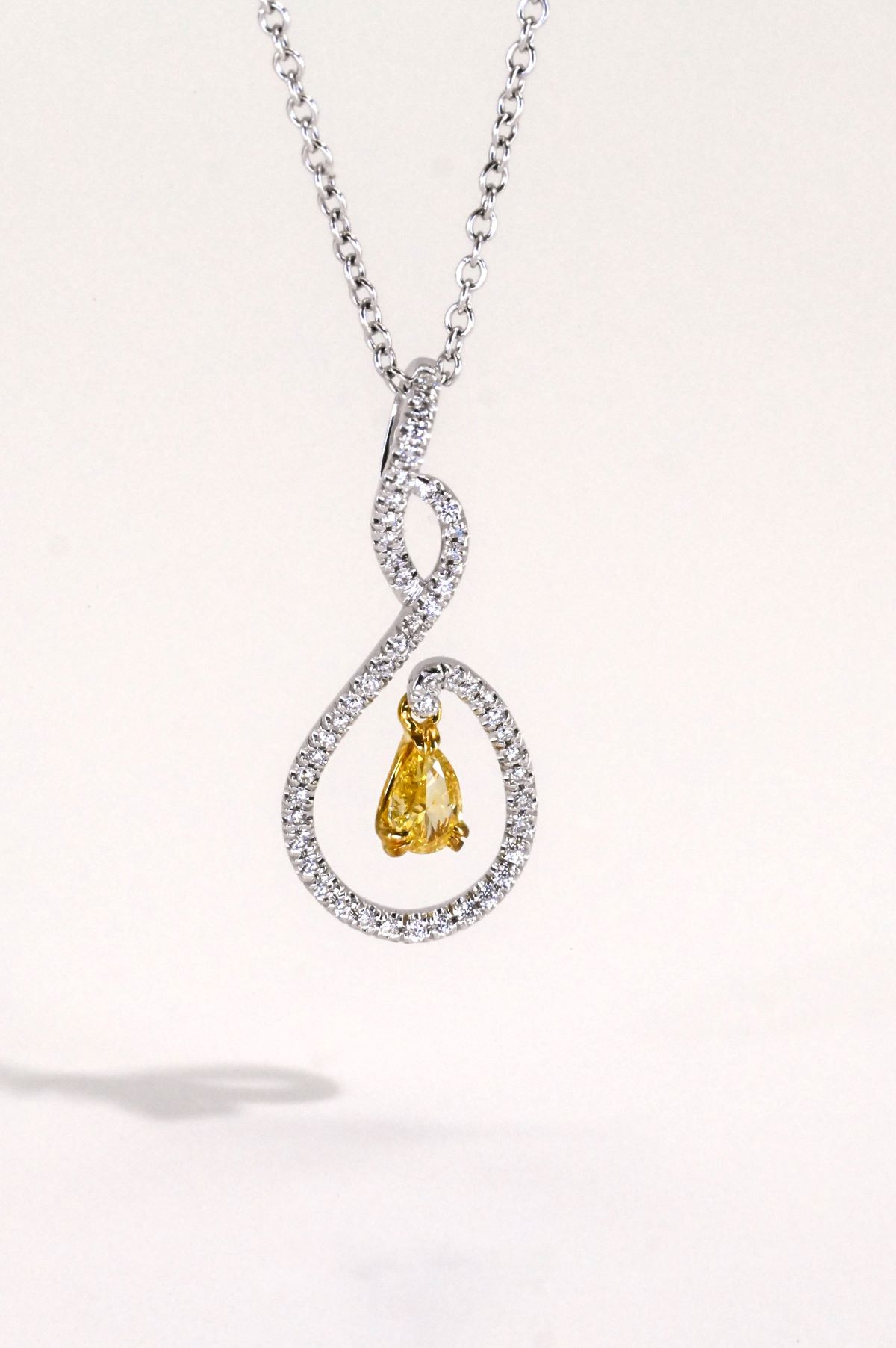 Chic and luminous, this 18Kt yellow and white gold drop pendant features a stunning 0.33 carat pear-shaped fancy yellow diamond as its focal point, radiating warmth and elegance. Surrounding the center gem are 50 round white diamonds totaling 0.25 carats, offering a brilliant contrast against the rich yellow and white gold setting. Weighing 2.48 grams, this pendant is a delicate yet eye-catching piece, perfect for adding a touch of luxury to any ensemble.