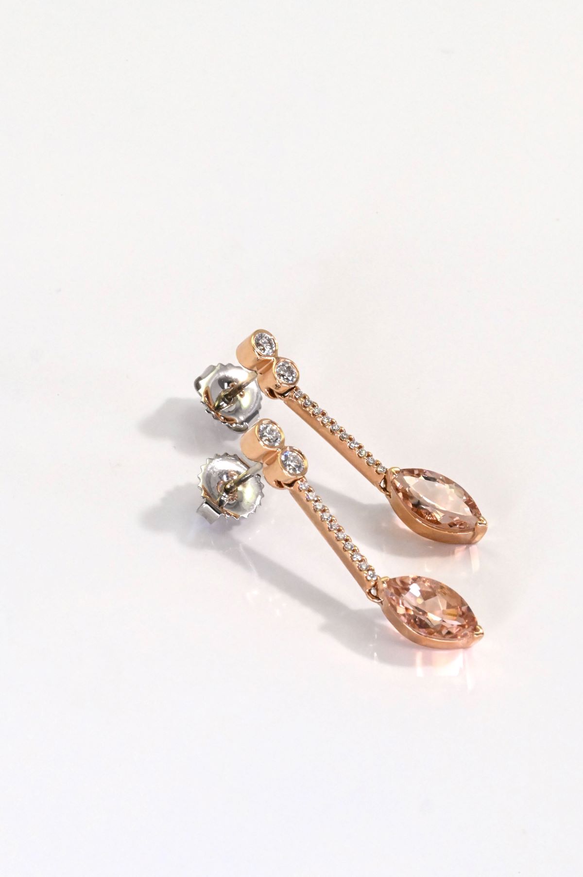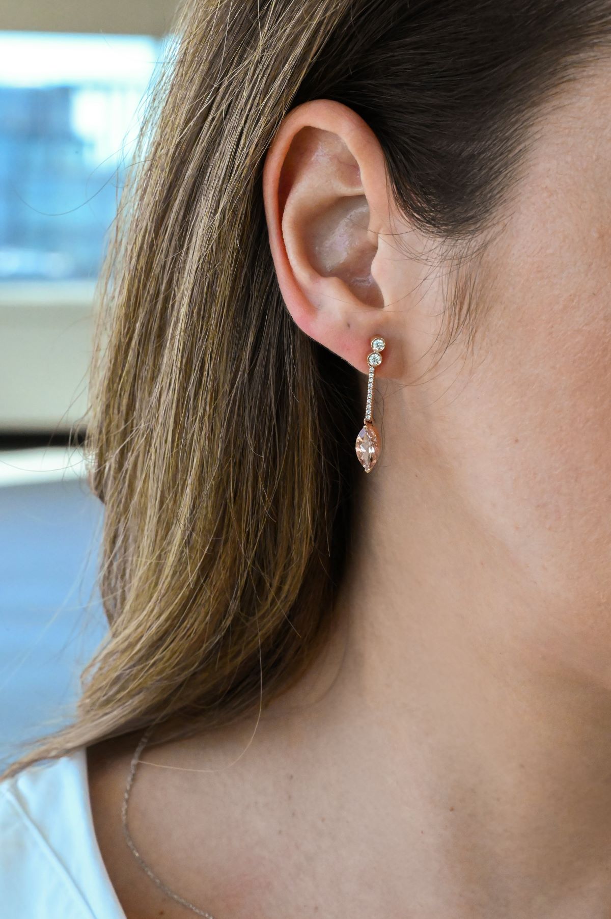 Crafted in 14K rose gold, these pendant-style drop earrings feature two marquise-cut natural Morganites totaling 2.01 carats, paired with 0.28 carats of sparkling diamonds for added brilliance. The drops are suspended from white gold studs with secure butterfly backs, blending soft blush tones with radiant sparkle. Elegant and feminine, this design offers a refined balance of color and light, perfect for both everyday wear and special occasions.