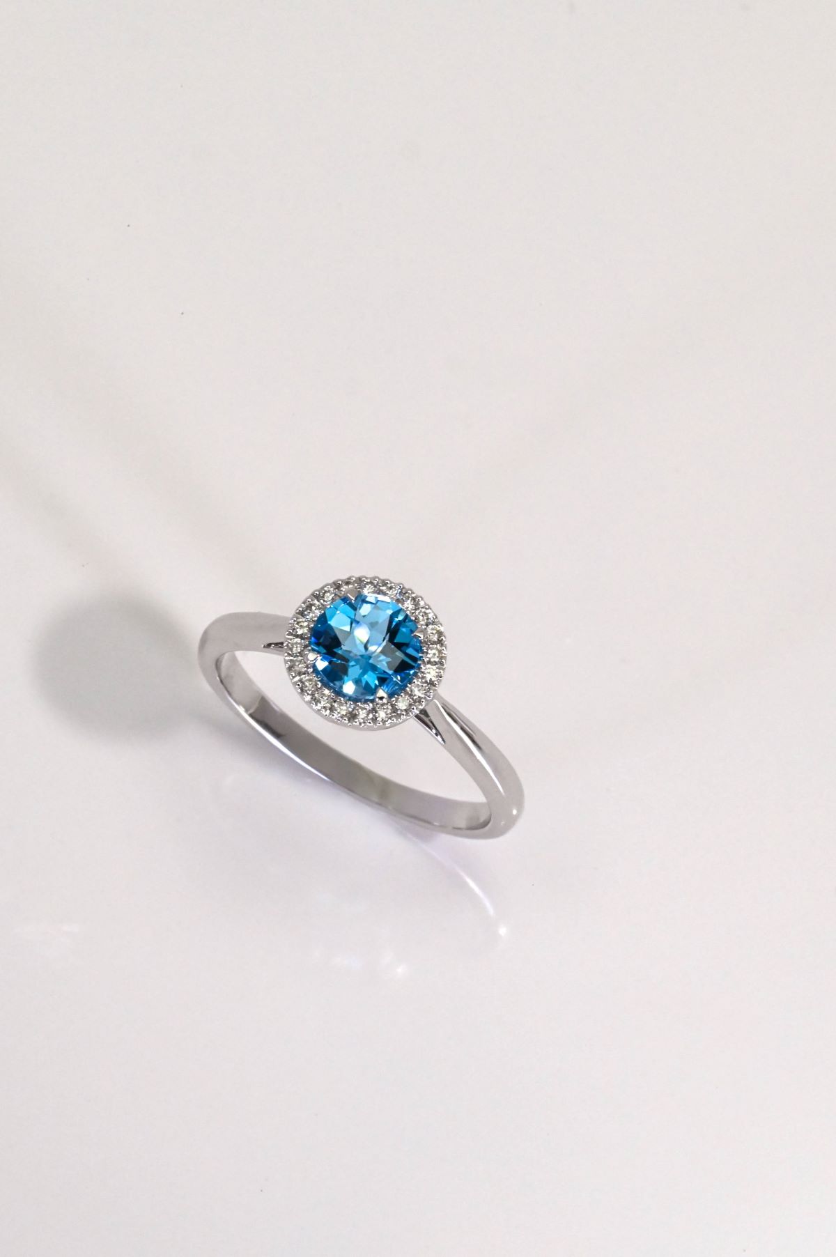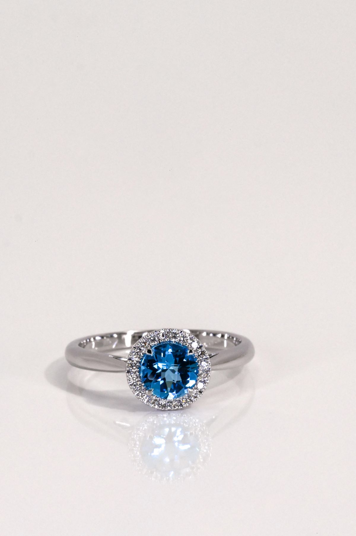 Crafted in 18Kt white gold with a sleek straight shank and polished finish, this elegant halo-style ring features a 0.70ct round faceted natural Swiss blue topaz. Surrounded by 20 round brilliant cut diamonds totaling 0.11cts (VS/FG), this 3.17g ring offers vibrant color and refined sparkle in a timeless design.