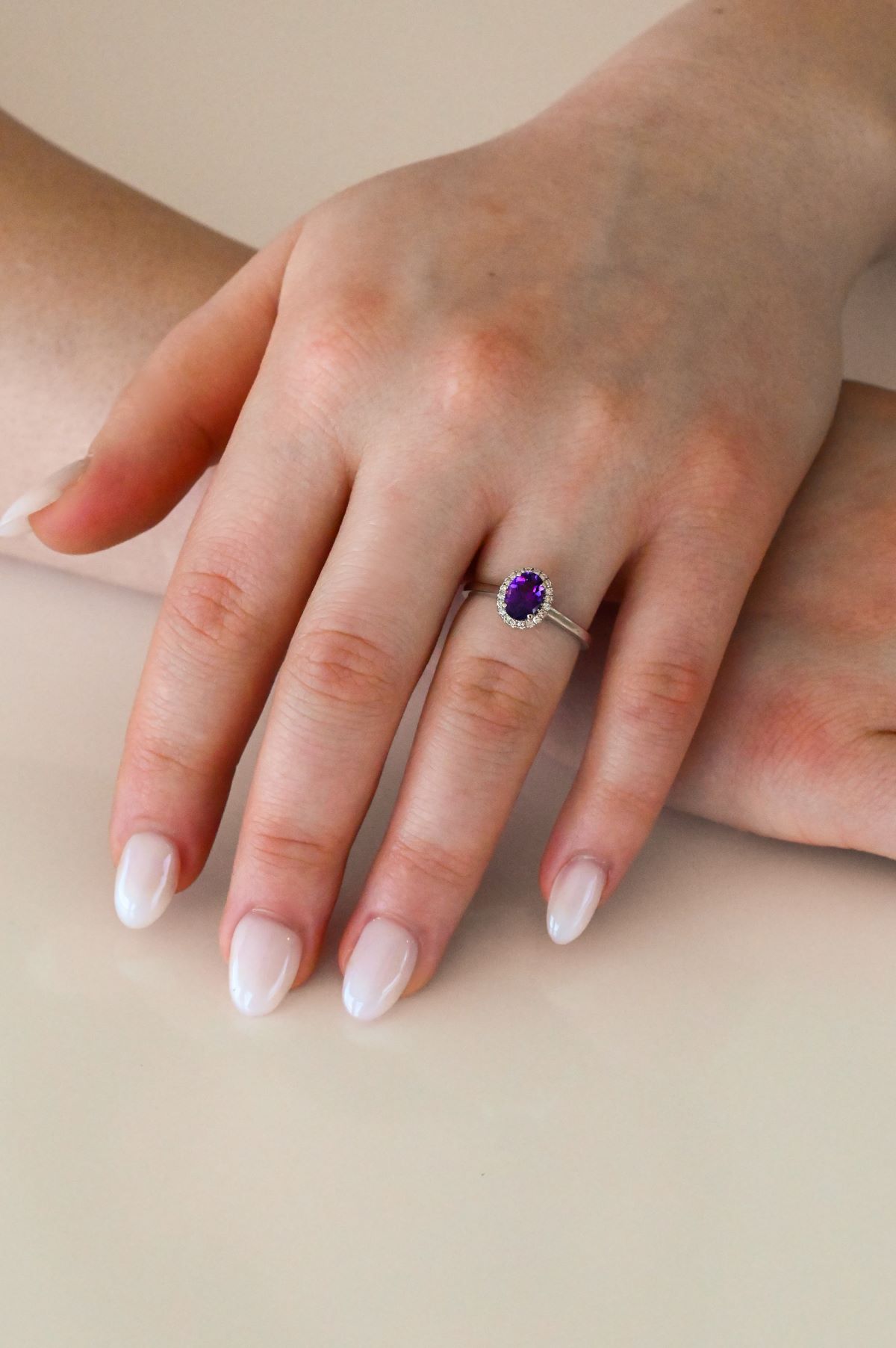 This refined ladies dinner ring is crafted in luminous 18Kt white gold with a classic halo setting and a sleek straight shank. At its center sits a 0.75ct oval faceted natural Amethyst, known for its rich violet hue and timeless appeal. The centerpiece is surrounded by 20 round brilliant cut diamonds, totaling 0.12ct (VS clarity, FG color), offering a graceful halo of sparkle. With its clean lines and polished finish, this ring strikes a perfect balance between classic elegance and modern sophistication.