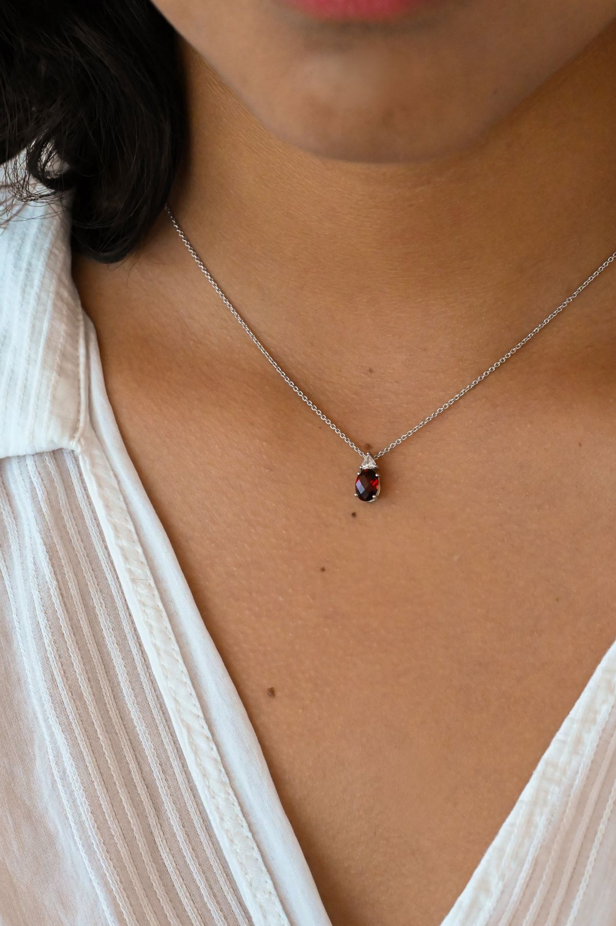 Elegant and refined, this 18K white gold pendant features a rich 1.04ct oval natural Garnet, set in a classic two-level gallery design. A sparkling 0.09ct trilliant cut diamond (SI1 clarity, F colour) adds a unique accent, offering contrast and brilliance. A timeless piece with a modern edge—perfect for everyday luxury or special occasions.