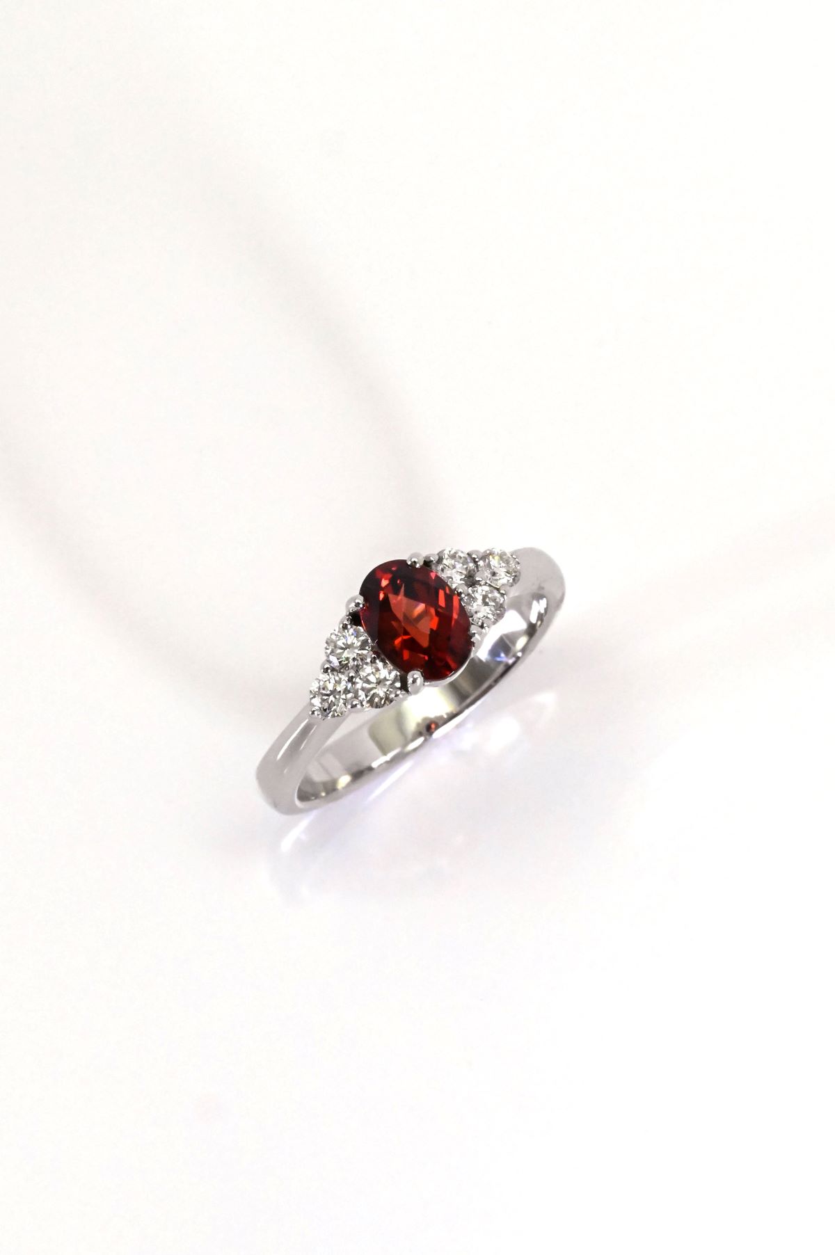 Crafted in 18K white gold, this elegant dinner ring features a reverse-tapered shank and a two-level three-stone head with a sleek, plain high-polish finish. At its center rests a 1.13ct oval-faceted natural garnet, showcasing deep, rich red tones. The garnet is flanked by round brilliant-cut diamonds totaling 0.37cts, graded SI1/F, adding refined sparkle and balance. A timeless and sophisticated design, perfect for both special occasions and everyday elegance.