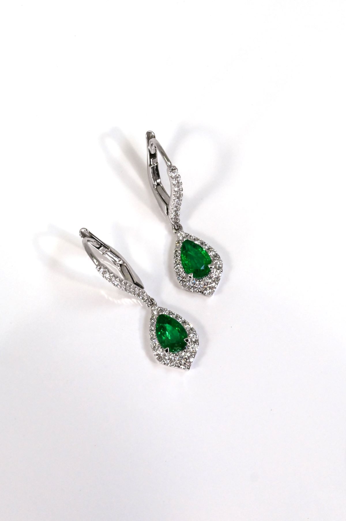 Crafted in 18K white gold, these elegant drop design pierced earrings feature pear-shaped drops with diamond-set European backs. The pair is set with 2 pear-faceted natural fine emeralds totaling 0.78 carats, complemented by 46 round brilliant-cut diamonds with a combined weight of 0.52 carats, graded VS clarity and F–G color.