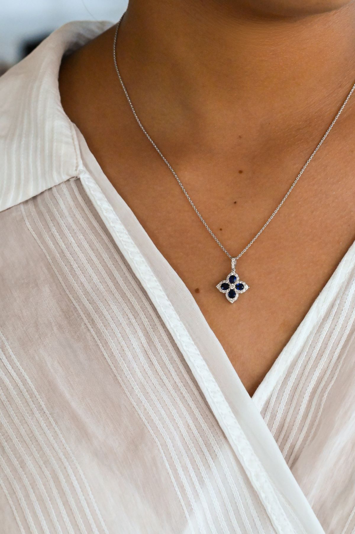 Delicate and radiant, this 18Kt white gold pendant features a graceful four-point star design, symbolizing light and elegance. At the heart of the piece, four pear-shaped natural blue sapphires (0.77cts total) are arranged to form the points of the star, their rich hue accented by a halo of fine round brilliant cut diamonds (0.37cts total). The pendant is suspended from an 18″ fine cable link chain, creating a timeless and graceful silhouette.