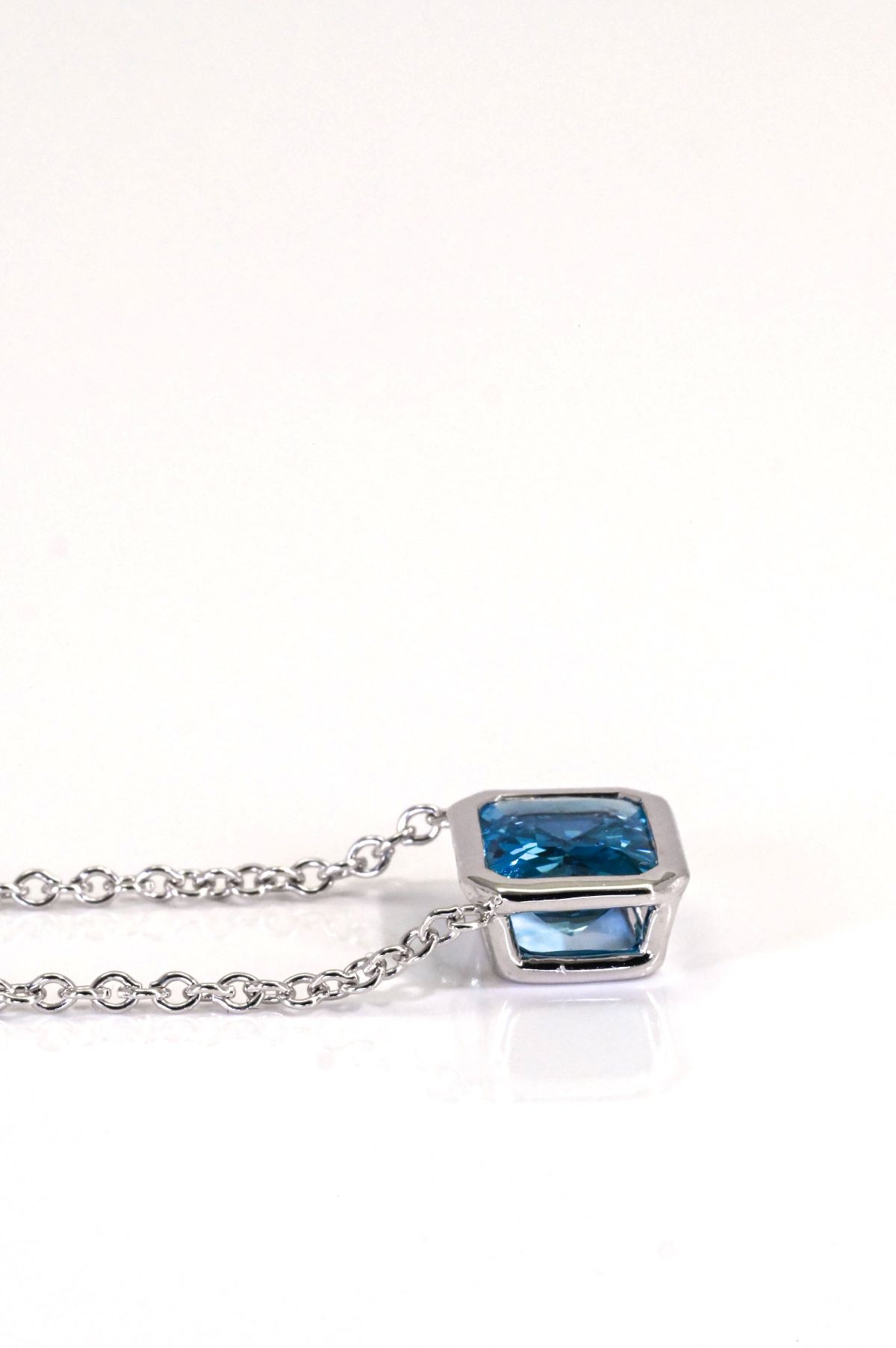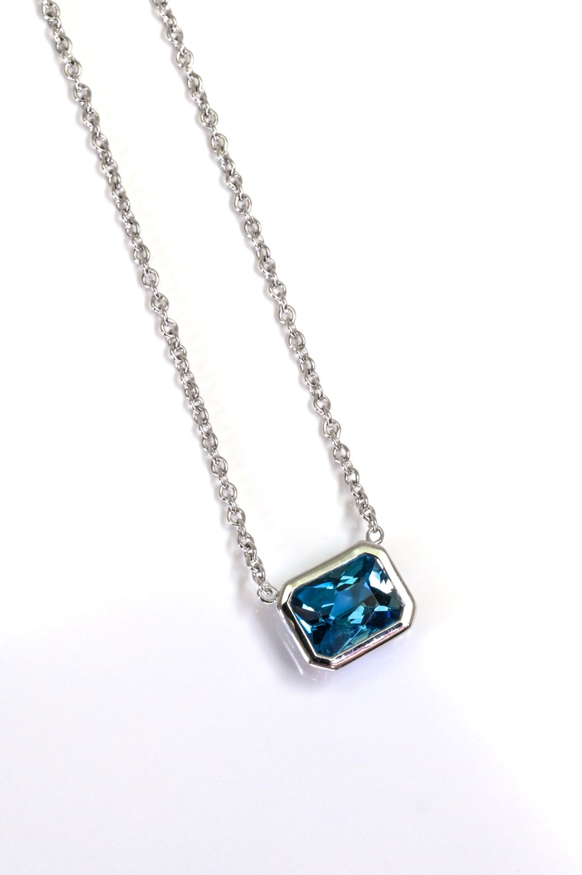 This sleek pendant features a 1.73ct oval blue topaz (8x6mm) securely set in a full bezel of 14Kt white gold. Suspended from an attached 18-inch chain with a lobster claw clasp, this piece offers modern simplicity with a vibrant pop of color—perfect for everyday elegance.