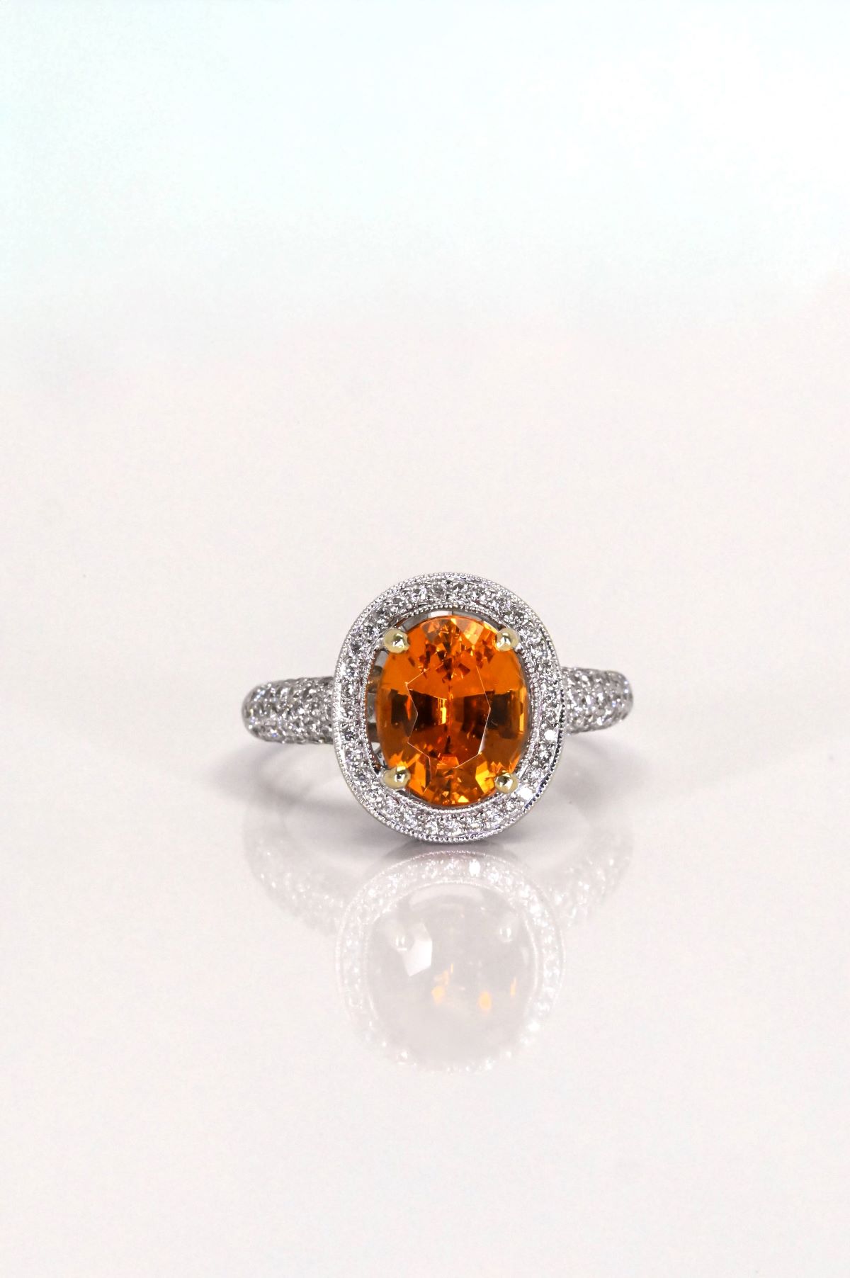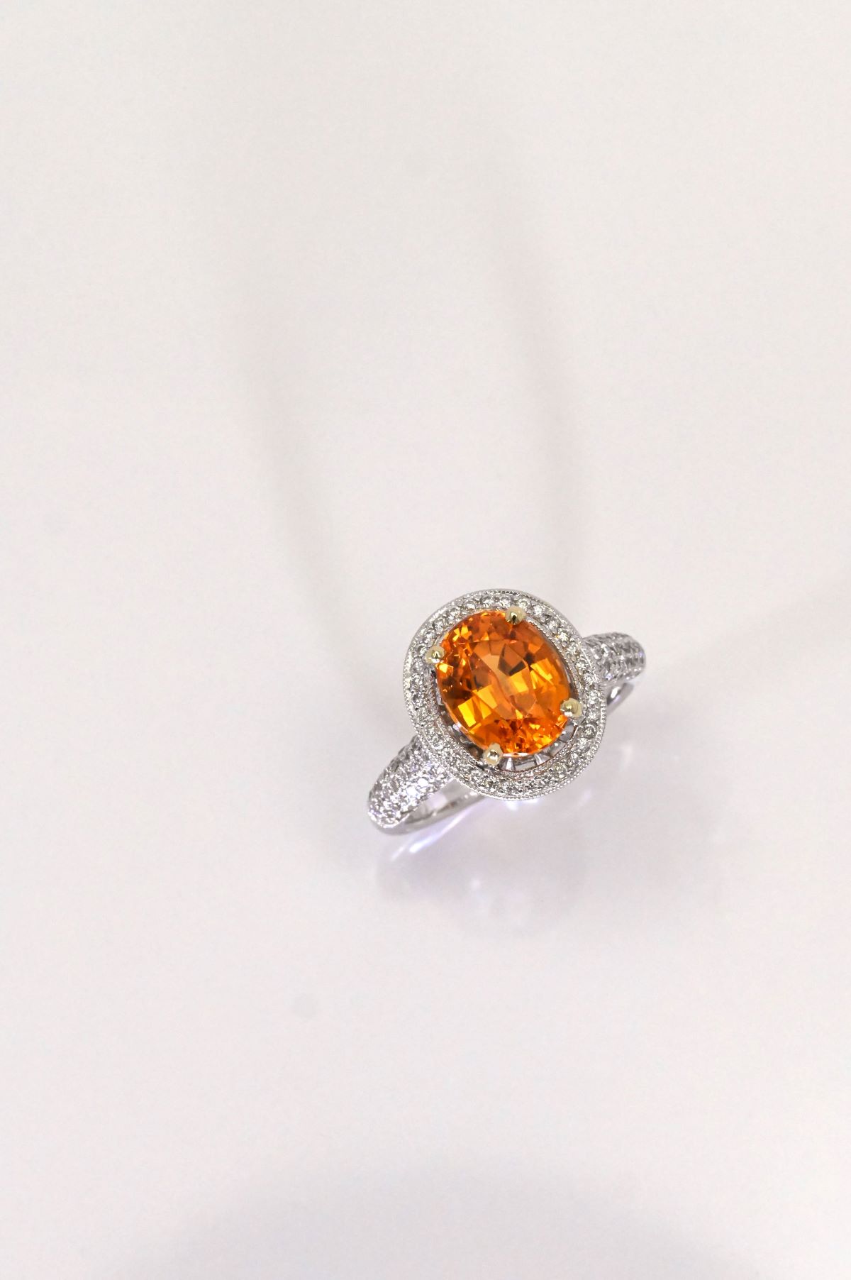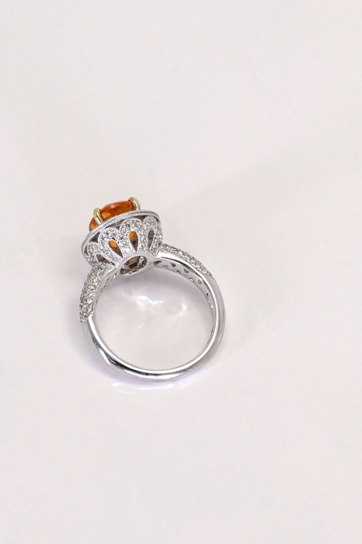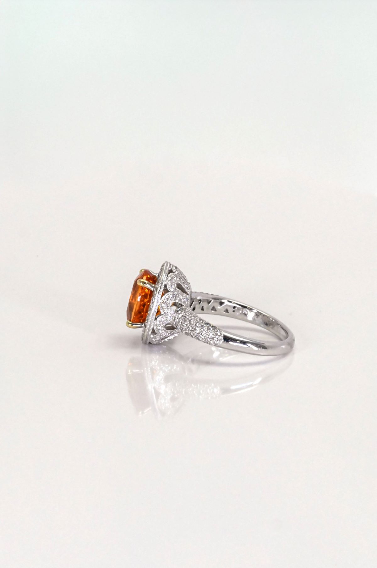 Crafted in 18K white gold, this exquisite dinner ring showcases an antique-inspired design with delicate milgrain and filigree detailing. At its center rests a striking 4.08ct oval-faceted natural Spessartite garnet, displaying an intense medium-dark orange hue full of fiery brilliance. Surrounding the center stone, 0.77cts of round brilliant-cut diamonds add refined sparkle and contrast, enhancing the rich warmth of the garnet. A true statement piece, this ring combines timeless craftsmanship with the vivid beauty of rare gemstones.