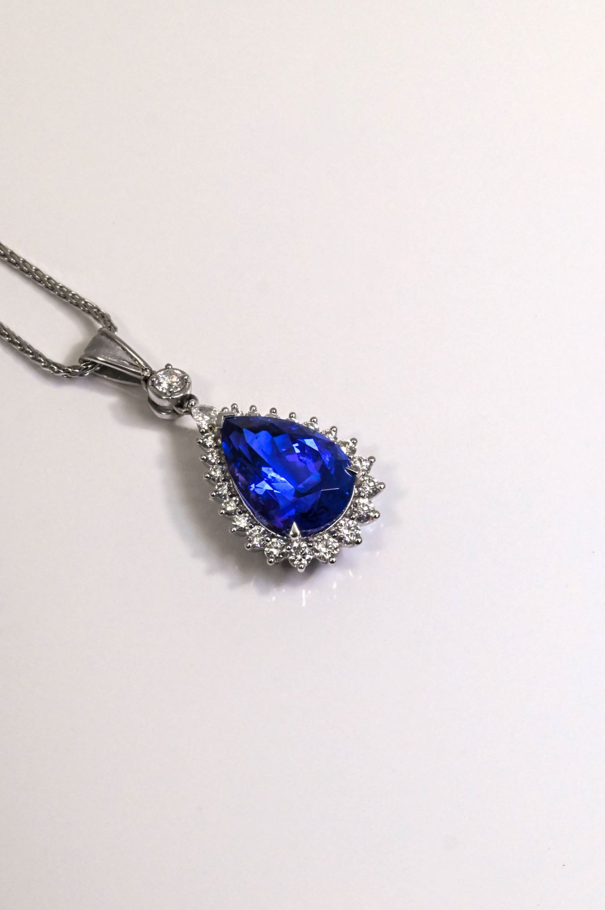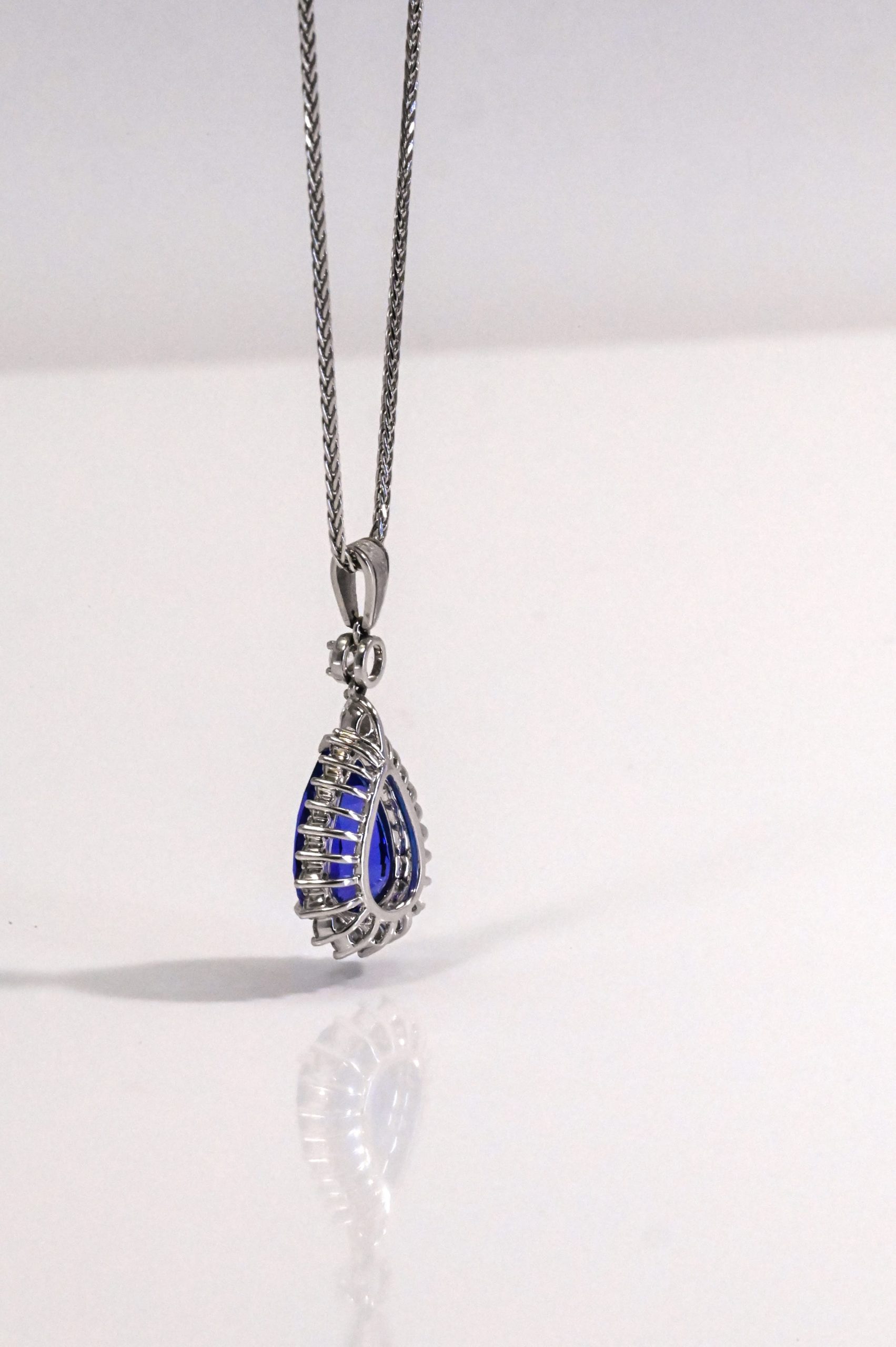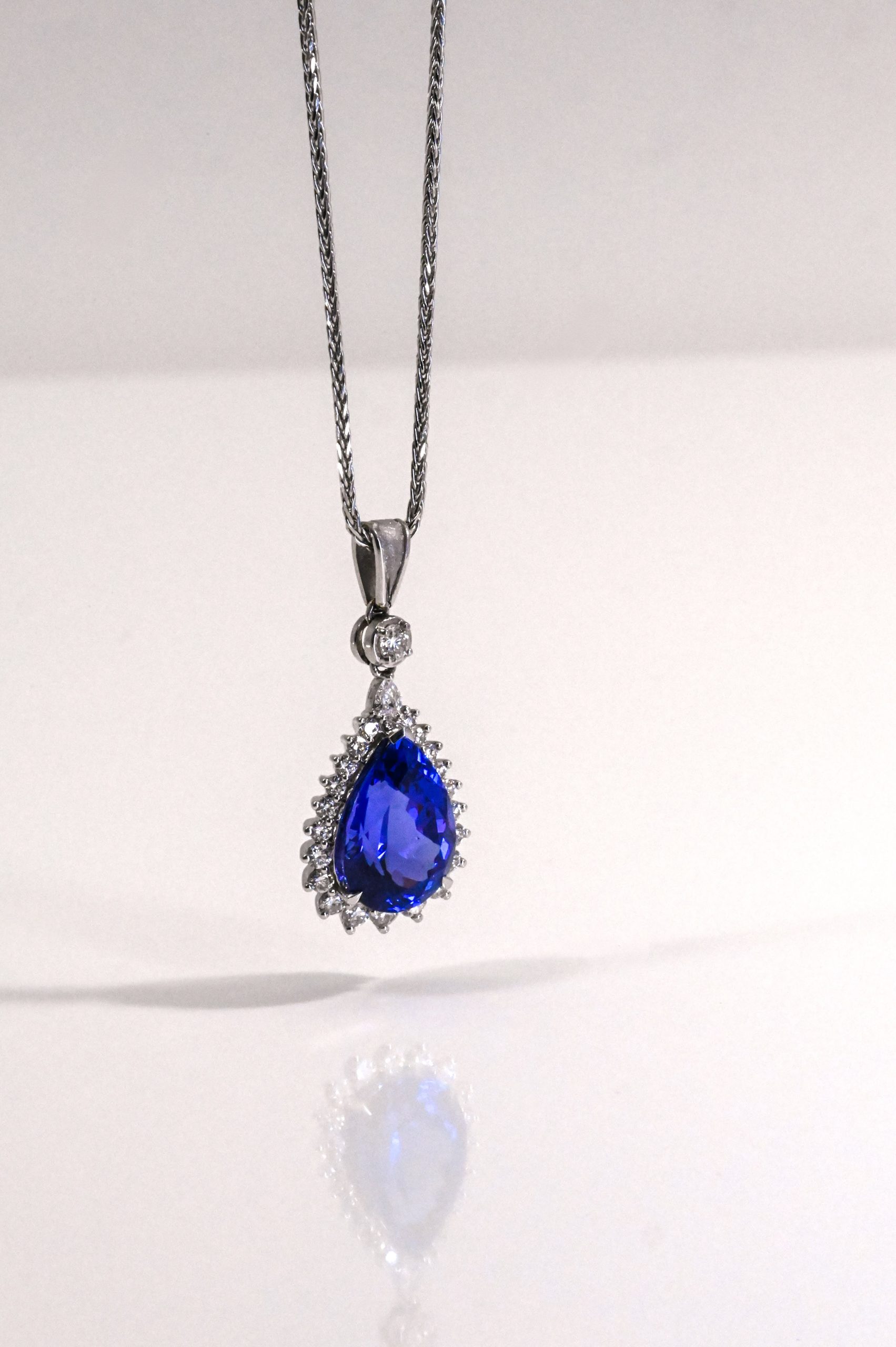 An extraordinary drop pendant crafted in 18kt white gold, showcasing a 5.90ct pear-shaped Tanzanite of exceptional color, cut, and clarity. Encircled by a radiant diamond halo and suspended from a diamond-set spacer with a graceful V-shaped bail, this piece is further adorned with 0.90cts of round and pear brilliant cut diamonds, VS/F, offering unmatched brilliance and elegance.
