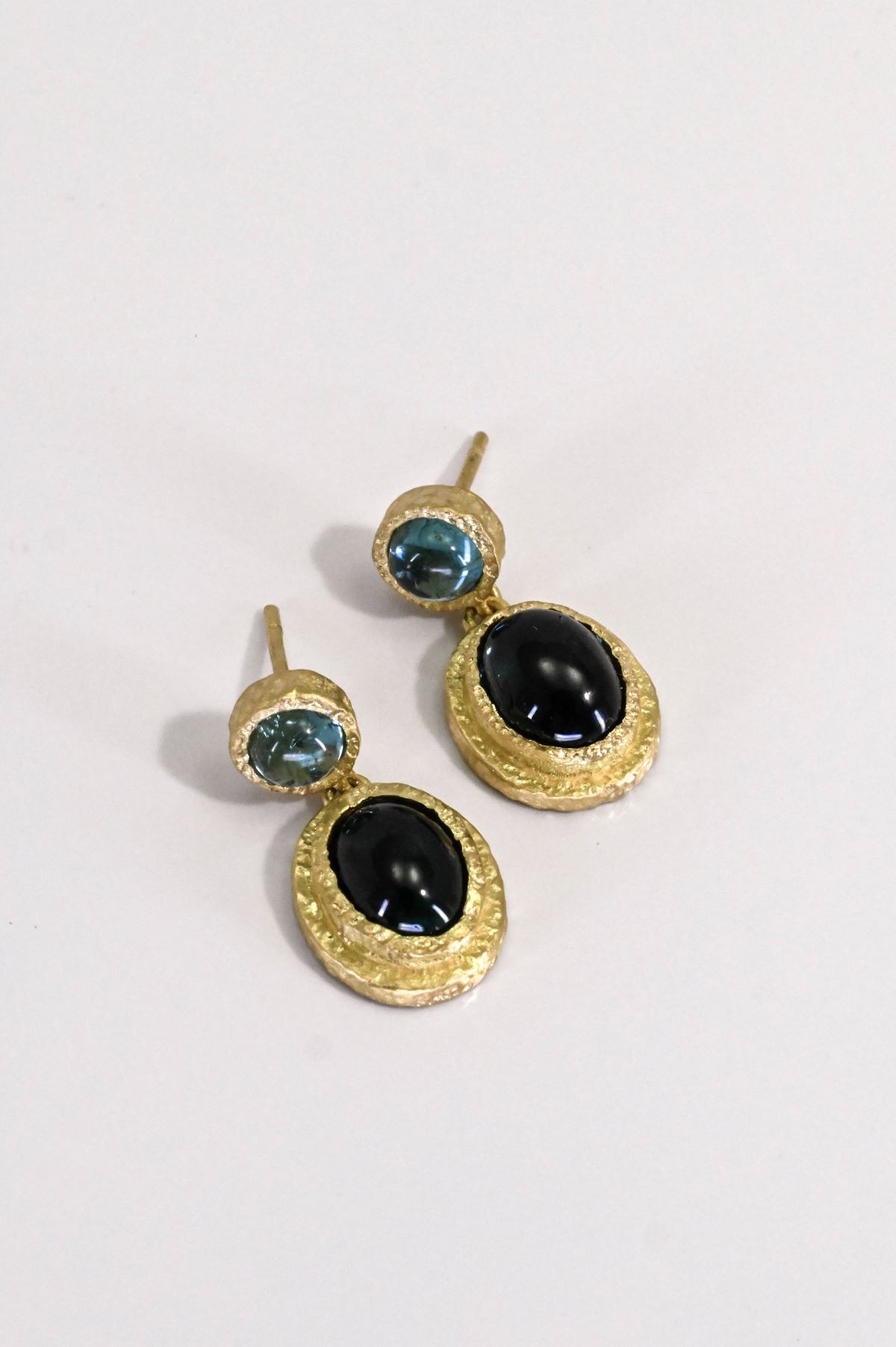 Crafted in 18-karat yellow gold, this Romanesque pierced earrings features two distinct pairs of cabochon-cut natural tourmalines. The first pair are round pastel blue-green tourmalines measuring 5 mm in diameter with a total weight of 1.30 carats, while the second pair are bezel-set with deep green oval tourmalines measuring 9 x 7 mm and totaling 4.88 carats. Each gemstone is elegantly bezel-set to highlight its natural color and brilliance, and the architectural gold designs draw inspiration from Romanesque motifs. Together, these earrings combine historic elegance with contemporary refinement, offering a sophisticated expression of color, craftsmanship, and timeless style.