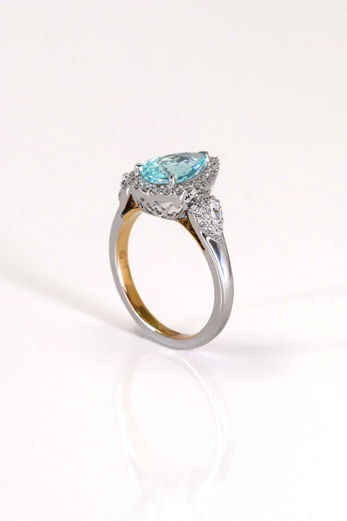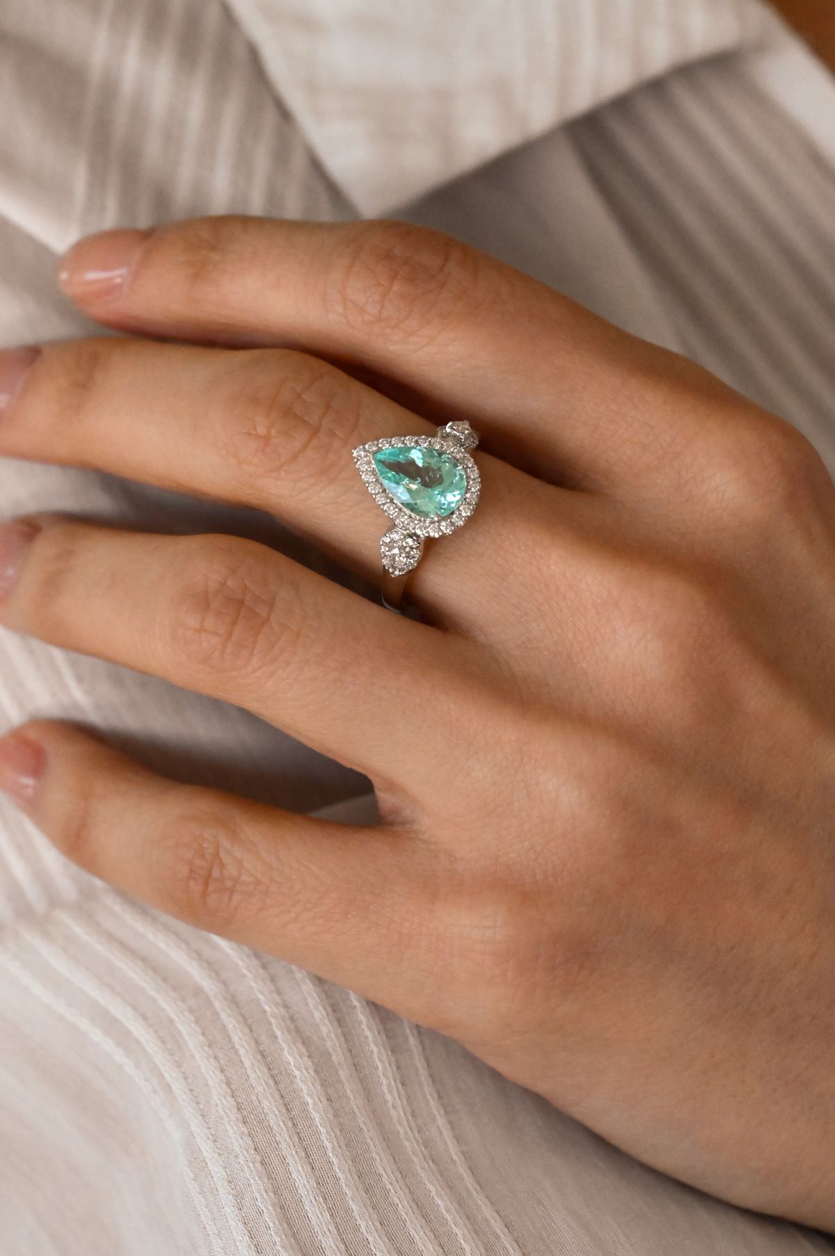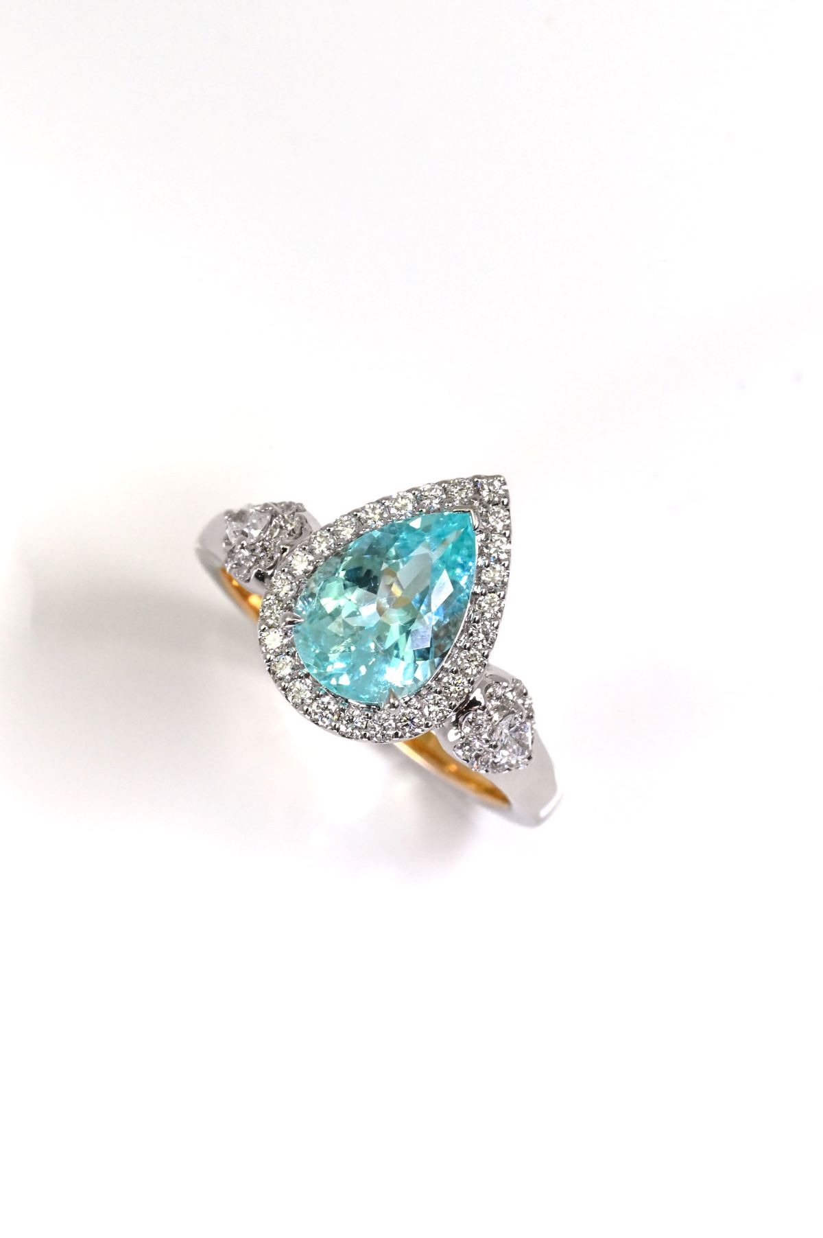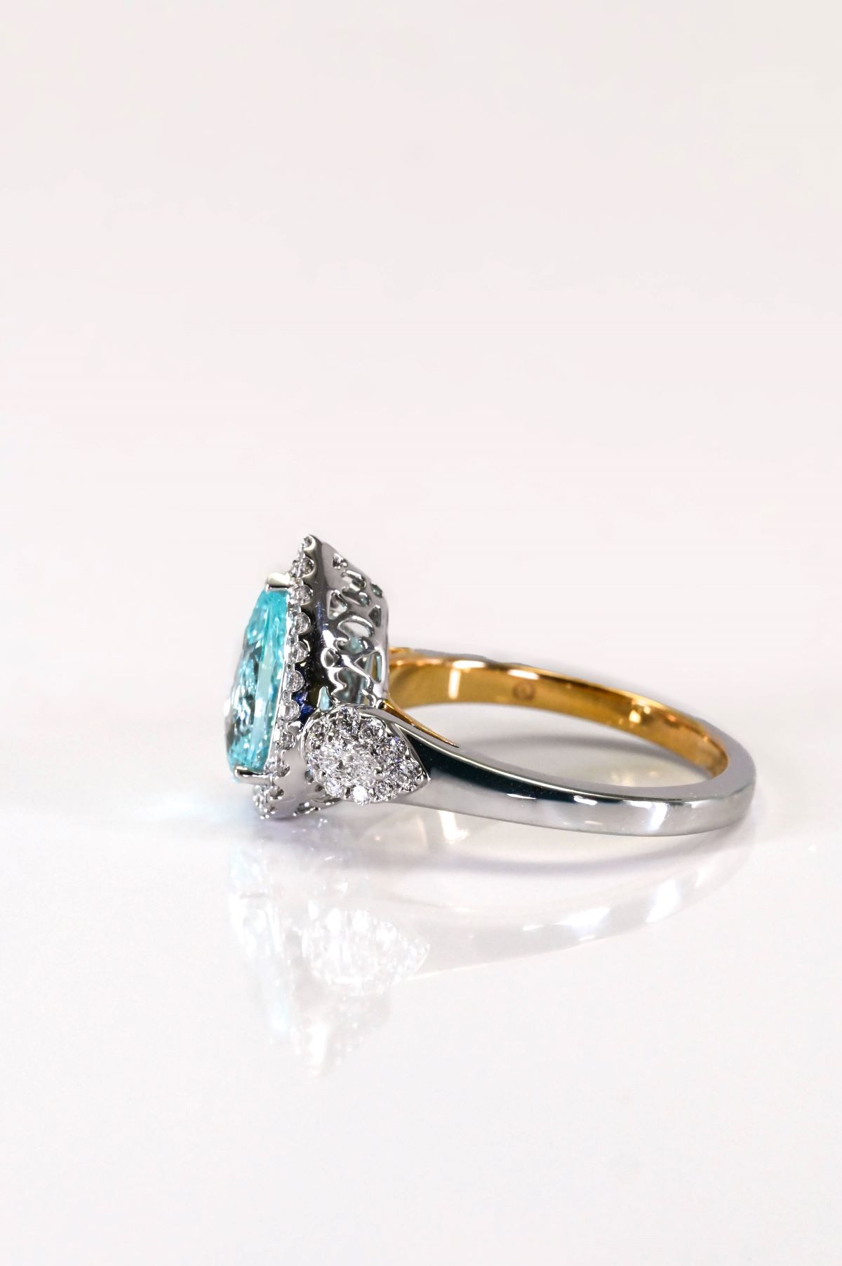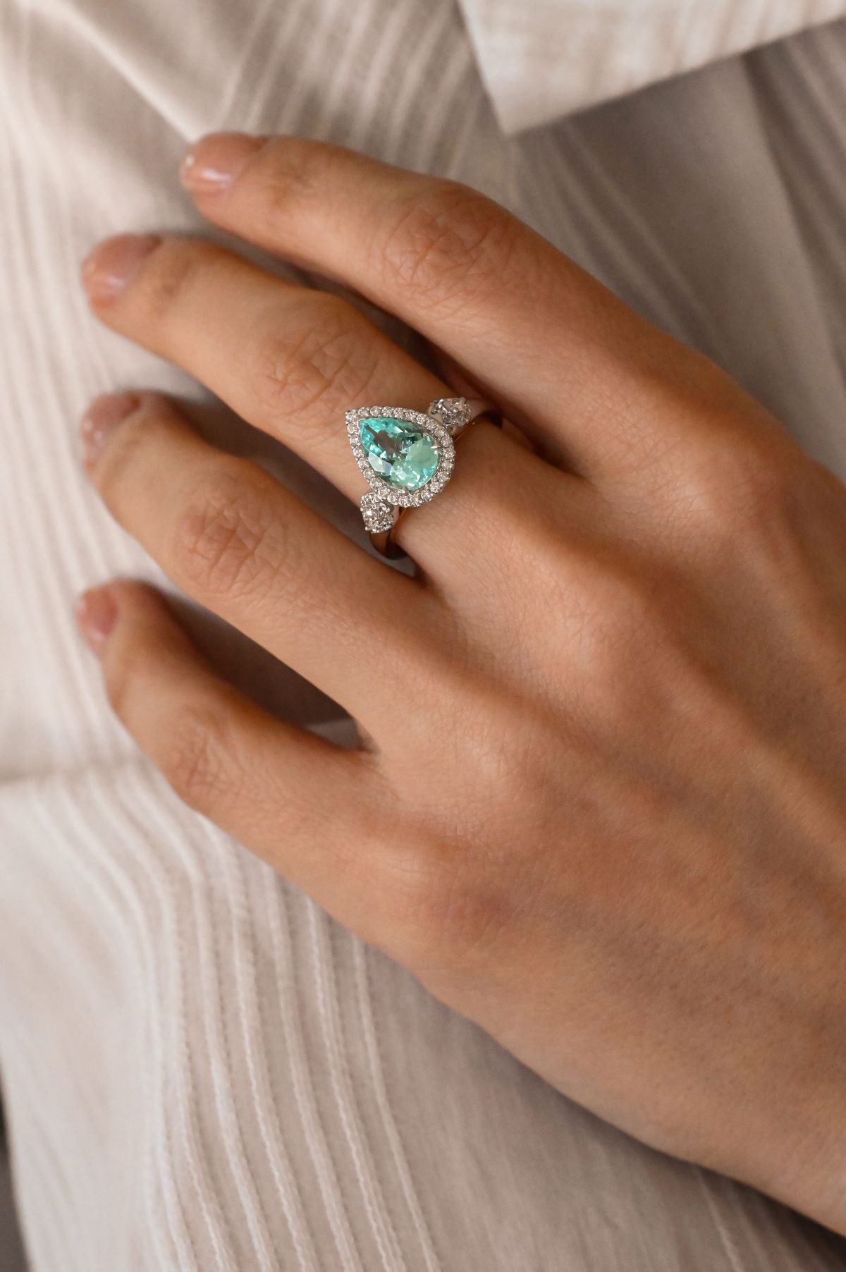 An exquisite 18Kt white and rose gold dinner ring featuring a pear-shaped halo design with diamond-set shoulders. The centerpiece is a 1.82ct pear faceted Mozambique Paraiba Tourmaline, its vivid electric blue color beautifully complemented by 0.48cts of sparkling natural white diamonds (VS/FG), creating a radiant and luxurious statement piece.