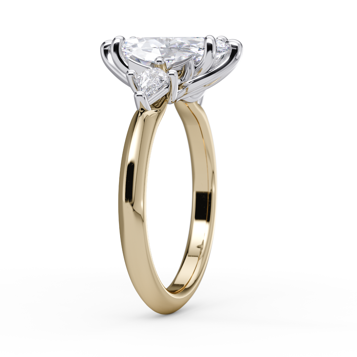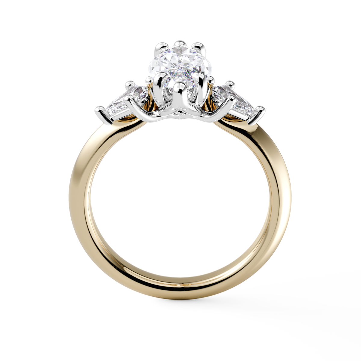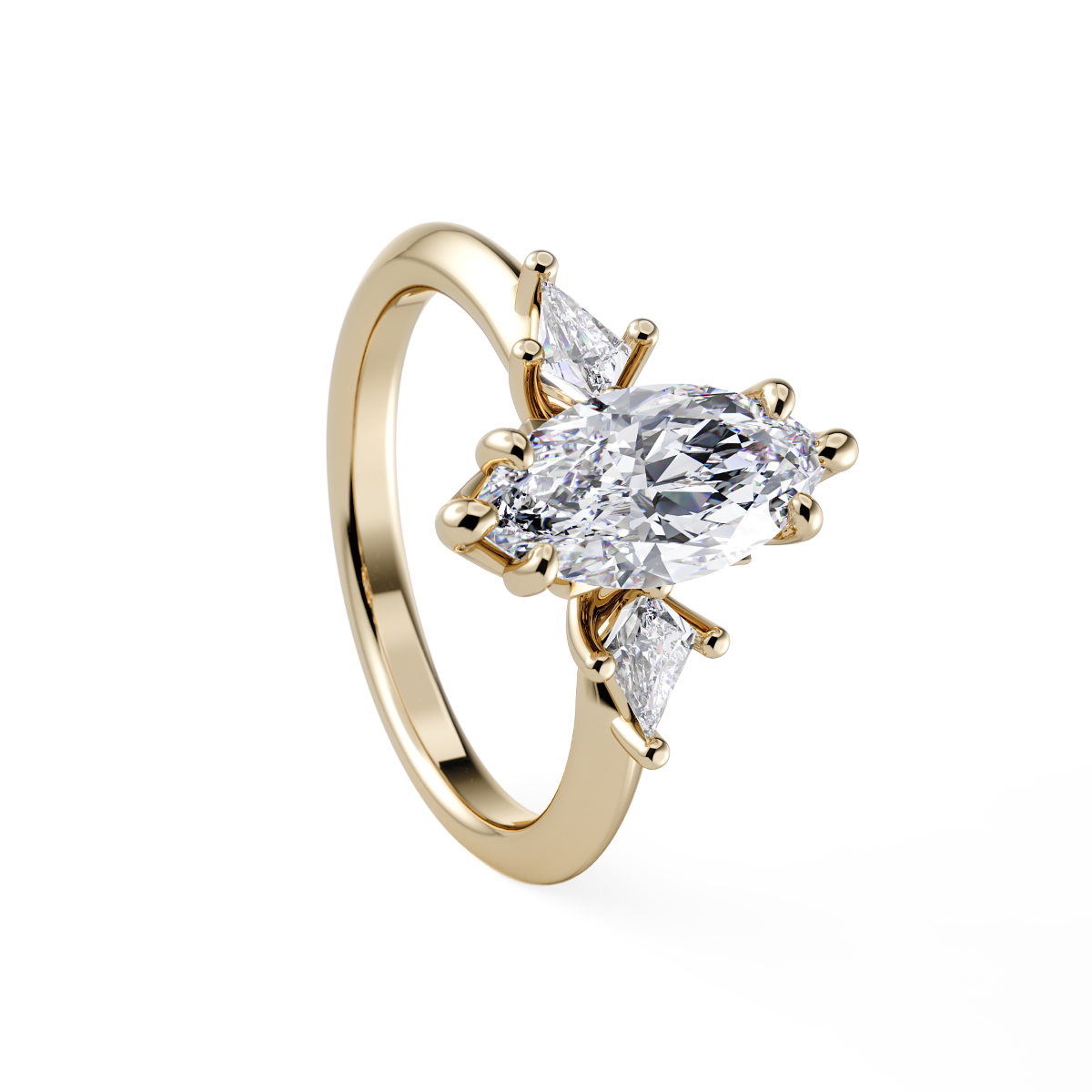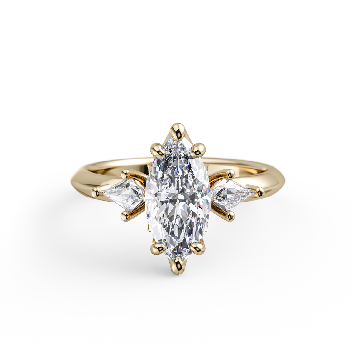 This nature-inspired three-stone ring evokes the fresh elegance of spring. A captivating marquise center diamond is flanked by unique kite-shaped side stones, creating a dynamic silhouette. The petal-style head cradles the stones with graceful, leaf-like curves, echoing the quiet beauty of new growth and organic form in nature.
