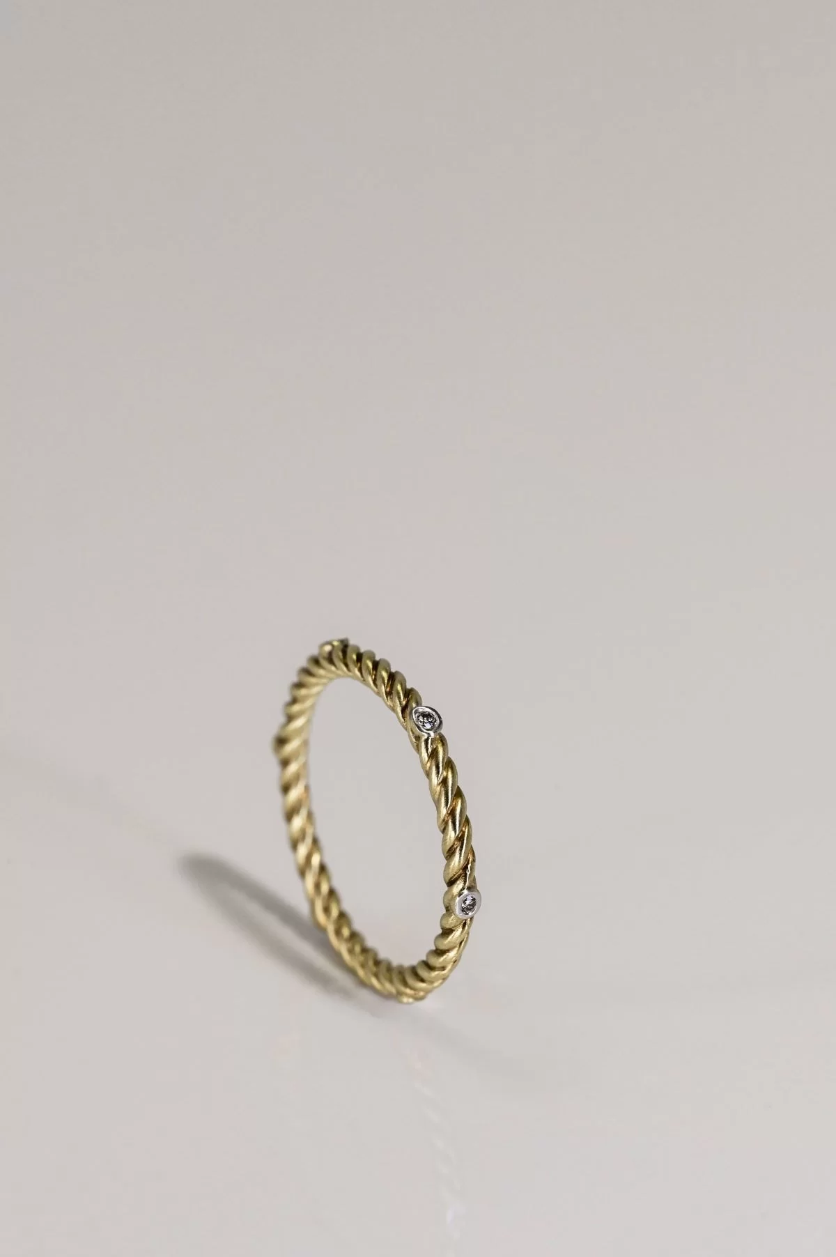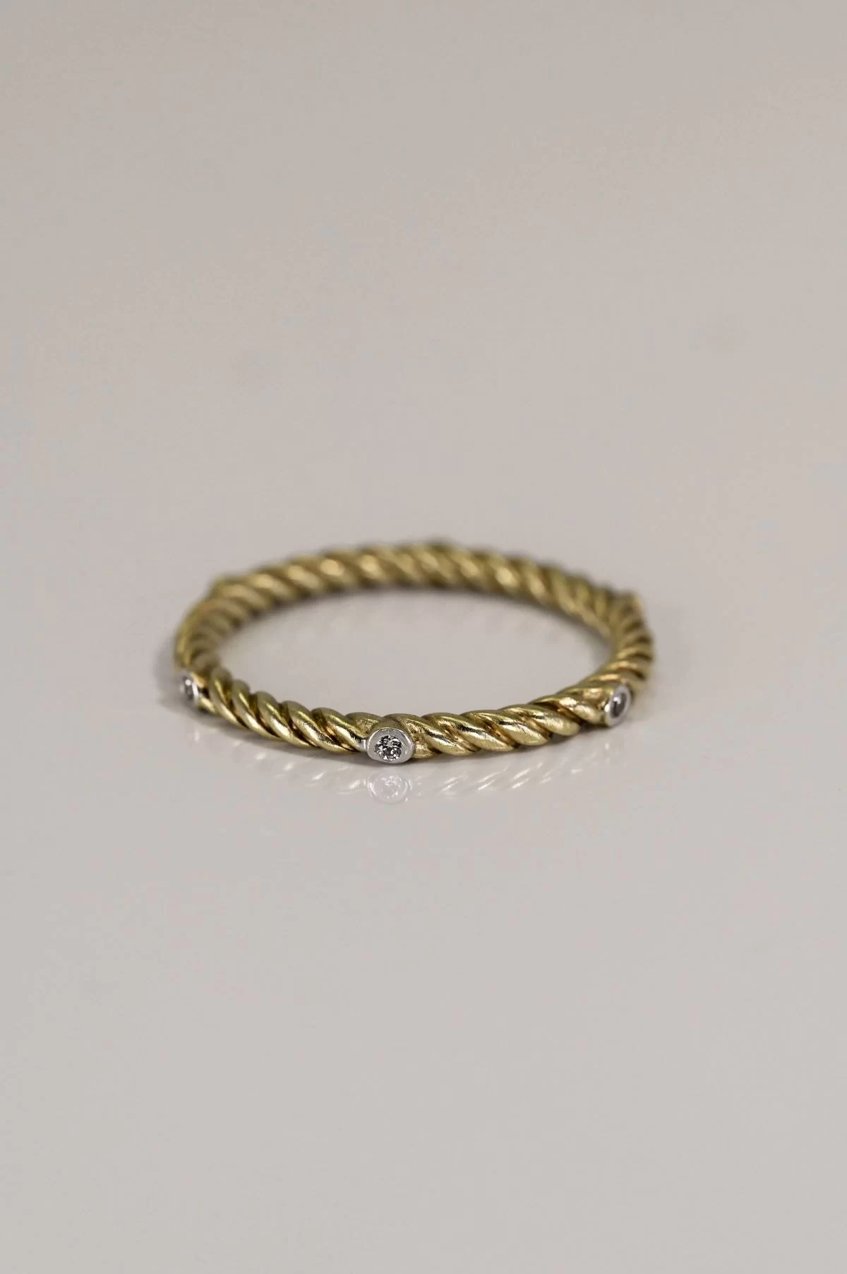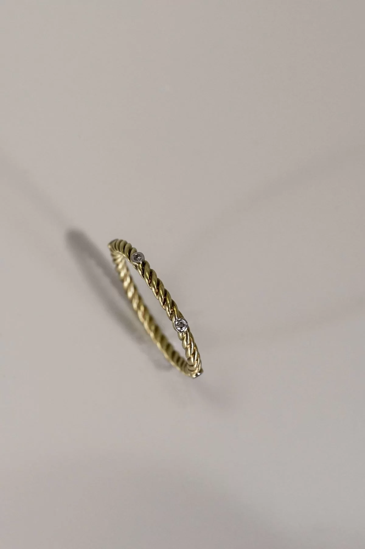 Delicate yet dazzling, this 1.7 mm twisted 14k yellow gold scatter band exudes understated elegance. Six round brilliant-cut diamonds, totaling 0.04 ct, are bezel-set along the sculpted twist, catching the light from every angle. Perfectly designed for everyday wear or as a stacking accent, this band fits a finger size 5.75 with effortless grace.