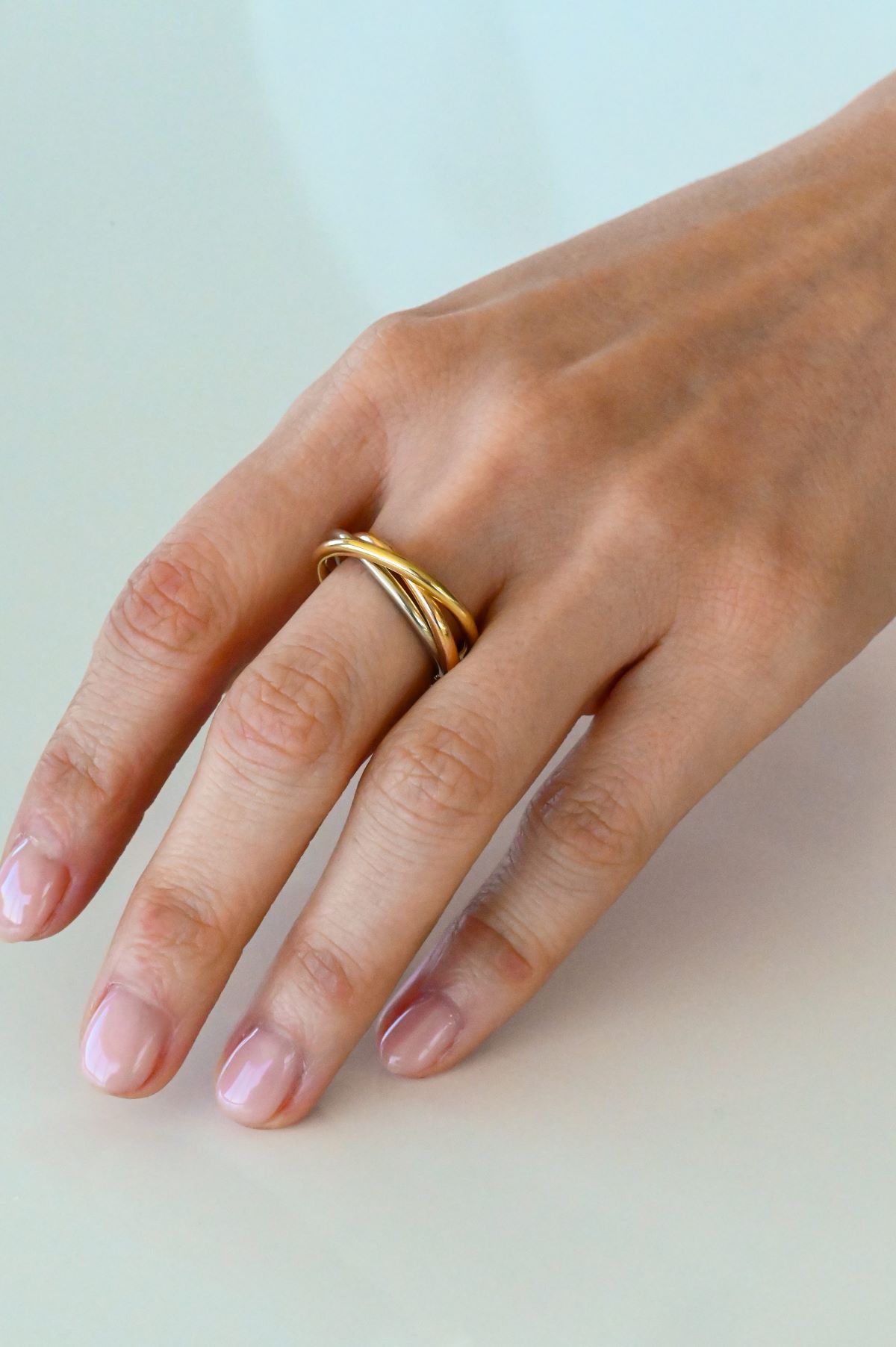 A timeless and elegant ring featuring three intersecting bands crafted in 14 karat white, rose, and yellow gold. Each band measures 2 millimetres in width and is finished in a half round comfort fit profile for effortless wear. With a total weight of 7.9 grams, this beautifully balanced design symbolises unity, harmony, and enduring style. Classic, versatile, and refined, it is a sophisticated piece suited to everyday luxury.