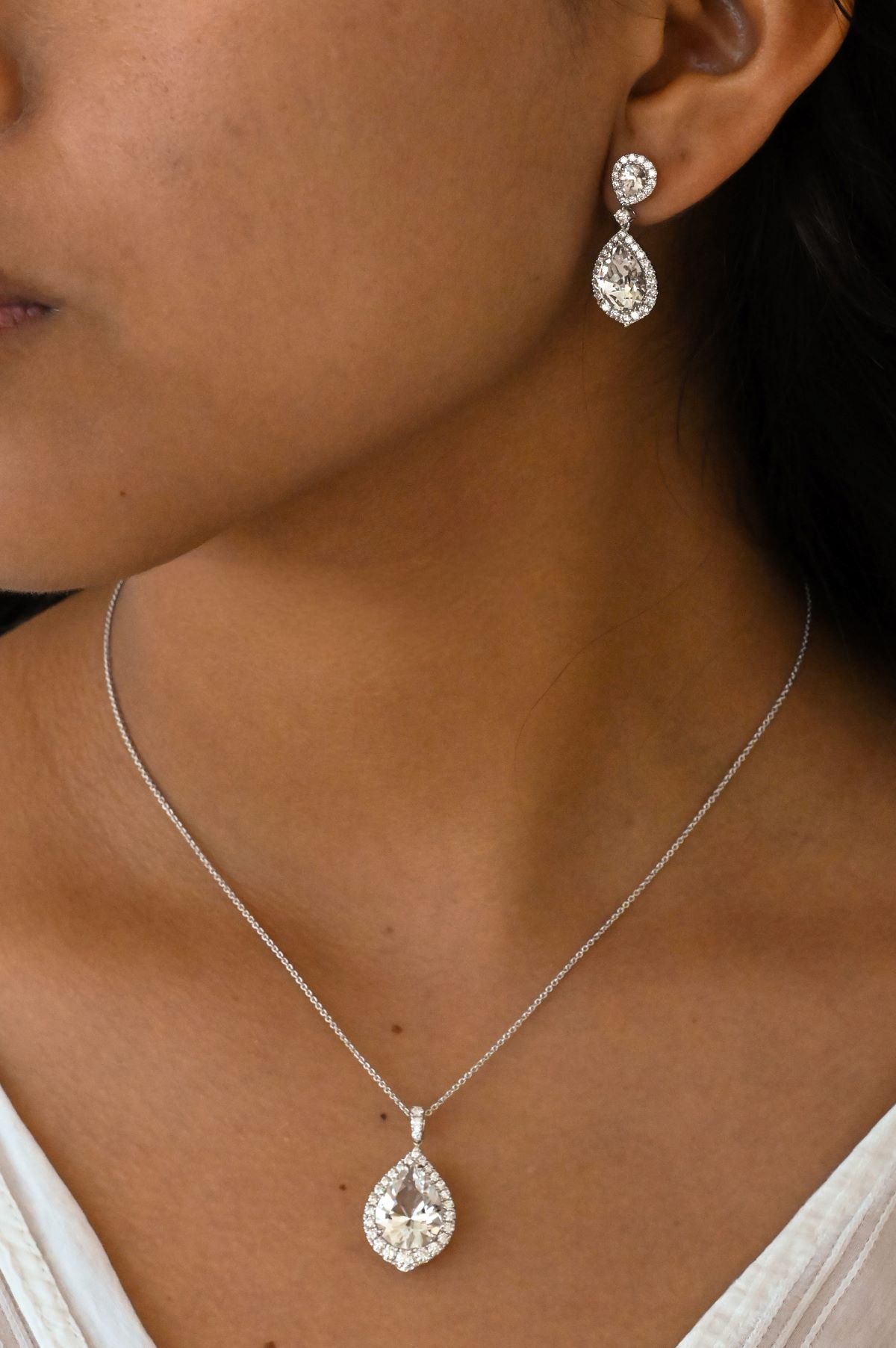 This elegant 18 karat white gold pendant features a stunning 6.17 carat pear-shaped natural white topaz, framed by a shimmering halo of natural diamonds totaling 0.65 carats. The pendant is gracefully suspended from a diamond-set bail and hangs from a fine 16-inch rolo link chain, offering timeless sophistication and sparkle perfect for any occasion.